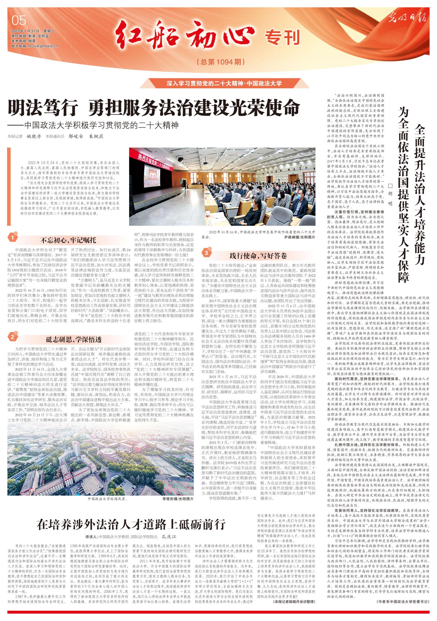 1月31日,《光明日报》在《红船初心特刊》中,以整版的篇幅报道了我校深入学习贯彻党的二十大精神情况。