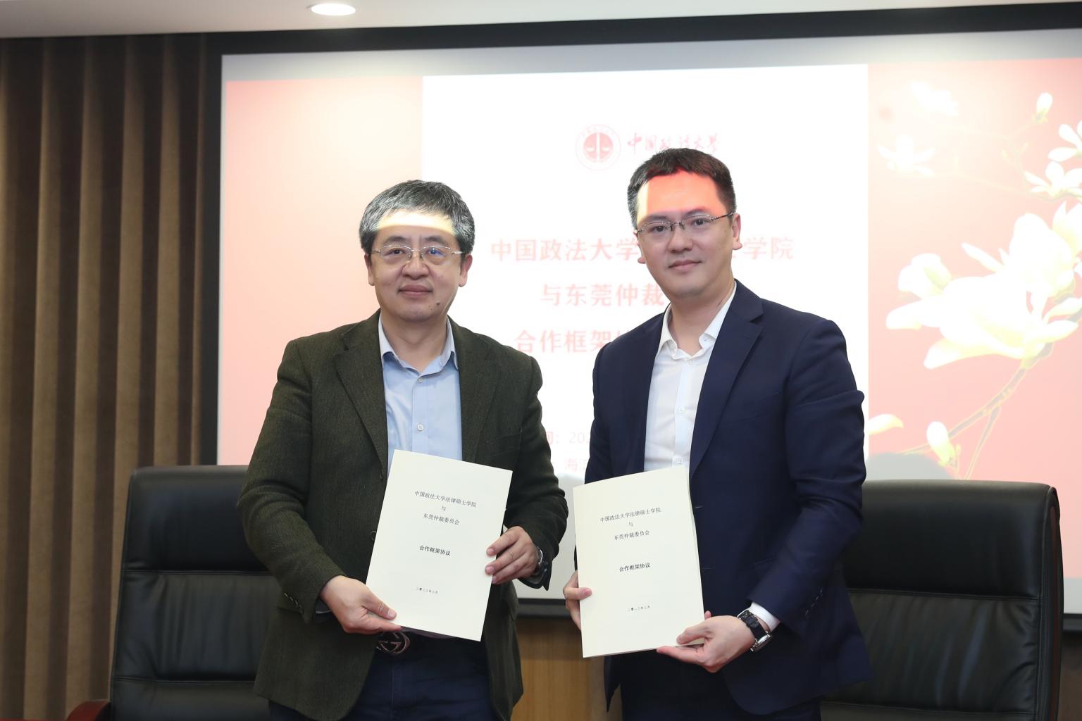 我校法律硕士学院院长许身健与潘长河代表双方签署《2026美加墨世界杯比赛时间法律硕士学院与东莞仲裁委员会合作框架协议》。