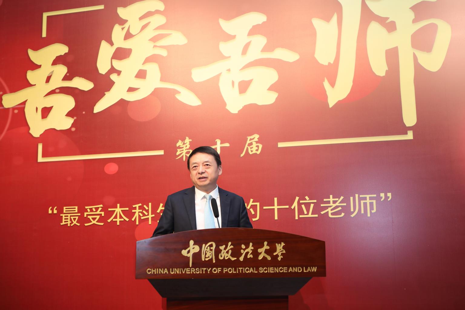 马怀德向“最受本科生欢迎的十位老师”获奖者表示衷心的祝贺,并结合自身体会和身边故事,阐释了他对“一名受学生欢迎的老师所应当具备的品格”的认识和体会。一要躬身育才树师表。要以身作则,真正用教师的人格、德行、学识,成为学生学习的典范、模范、表率。二要涵养学识强师能。要保持学习,刻苦钻研、严谨笃学,不断充实、拓展、提高自己。三要严慈相济铸师魂。要怀有仁爱之心,将无私的爱、不求回报的爱落在每一次作为、每一件善举之上,并继续延续学校老中青“传帮带”的优良传统,将这种优秀的师德传承下去。