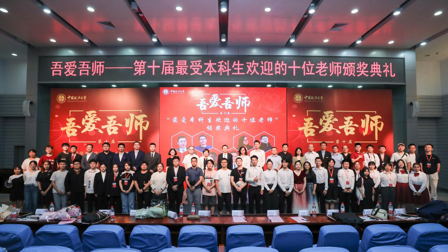 无论是合唱团倾情演唱的歌曲《点亮》,还是新闻通讯社创作、金话筒深情演绎的诗朗诵《您》,都传递了同学们对法大老师的真挚敬意。最后,受邀嘉宾和获奖老师共同登上颁奖台与同学们合影留念,共同延续了这个充满爱的瞬间,掌声经久不息。至此,吾爱吾师——第十届“最受本科生欢迎的十位老师”颁奖典礼圆满落下帷幕。