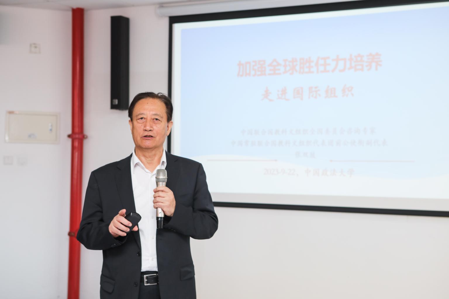 启动仪式完成后,张双鼓以“加强全球胜任力培养 走进国际组织”为主题为同学们进行了首次课程讲座。讲座中指出,二十大报告首次把教育、科技、人才进行“三位一体”统筹安排、一体部署,并摆放在论述“高质量发展是全面建设社会主义现代化国家的首要任务”之后的突出位置,要优先发展好教育,才能够统筹好科技、人才和创新的协同发展。张双鼓对全球胜任力的内涵及中国高校的国际组织人才培养举措、国际组织架构及中国与联合国的关系、国际组织任职要求等内容进行了详细的介绍和解读。随后,在答疑互动环节中,同学们与张教授就国际组织职业规划、个人国际胜任力提升与岗位适配性等问题进行了交流。
