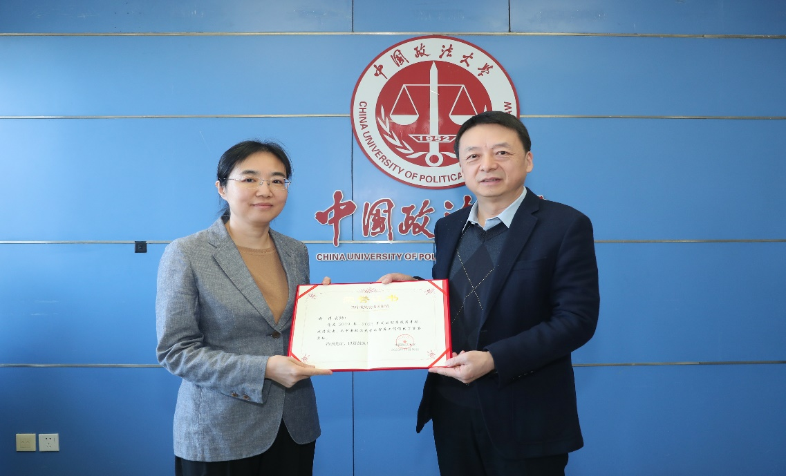 (马怀德向在智库建设方面取得卓越成绩教师颁发荣誉证书 摄影 卢云开)