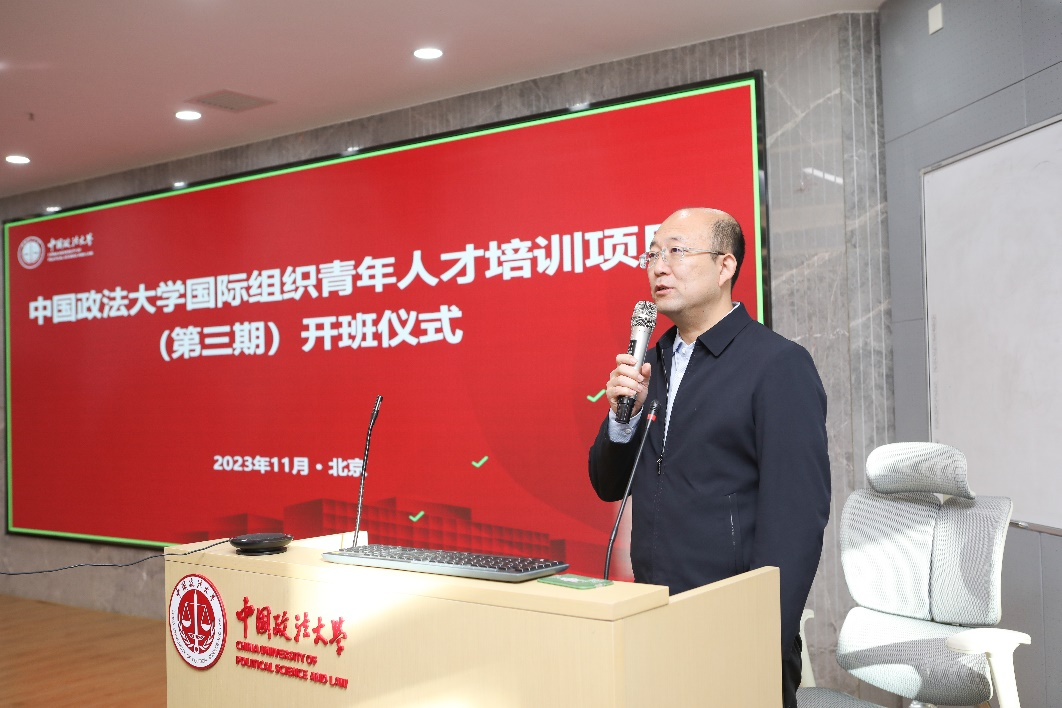 黄瑞宇代表学校对参加此次培训的嘉宾表示诚挚的欢迎。他表示,近年来,我校深入贯彻落实习近平总书记考察我校重要讲话精神,高度重视国际化法律人才培养,将其作为学校服务国家涉外法治建设需求、提升新时代高素质法治人才的重要举措。他认为,国际组织是制定国际规则、协调多边事务、分配国际资源的重要平台,是全球治理的重要阵地。培养推送毕业生到国际组织实习任职,有助于扩大到国际组织工作的后备人才队伍,提升我国在国际组织人员规模,对于服务国家发展战略和重大需求、拓宽毕业生就业领域具有重要的现实意义。他希望同学们珍惜此次学习机会,通过参与国际组织实习任职能力培训,强化对国际组织的深入了解和能力储备,为今后有机会国际组织实习任职,为中国参与全球治理体系改革和建设贡献自己的力量。