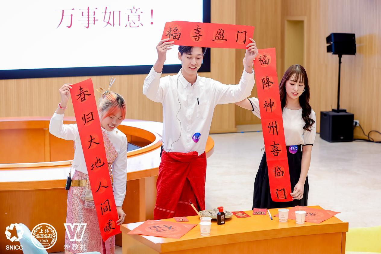 我校代表队由国际教育学院马琳琳、赵晓萌任赛事教练,通过现场案例开发与展析、名言名句解读、知识问答、情景评述、讲述中国故事等环节,对春节习俗的跨文化交际进行了深刻解读,并凭借清晰的逻辑、流畅的语言和默契的配合,充分发挥“中文+法学”特色专业优势,得到大赛评委会和在场师生的高度评价和一致赞扬。