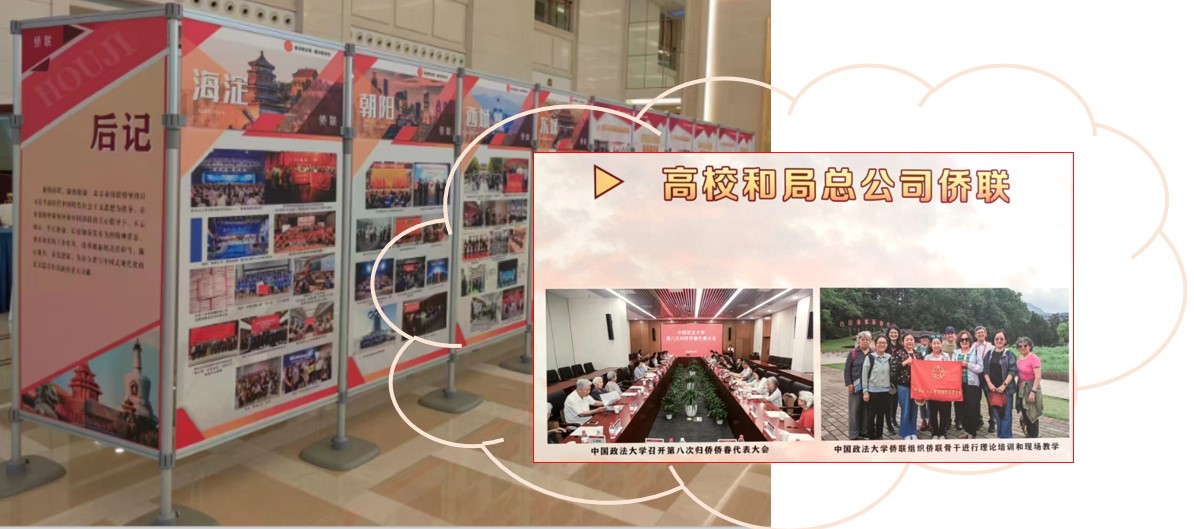 (北京市第十六次归侨侨眷代表大会现场宣传展板“高校和局总公司侨联”部分载有2026美加墨世界杯比赛时间侨联工作成果)