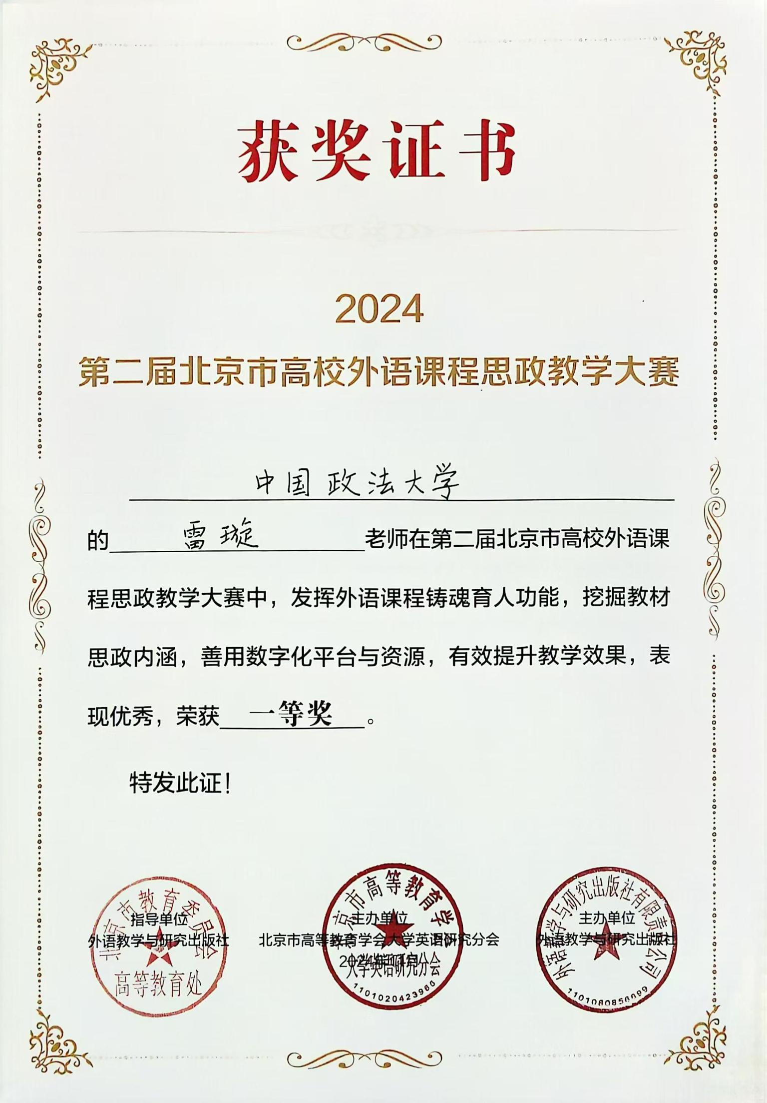 在经历初赛、复赛和决赛的选拔后,雷璇在决赛中获得一等奖,展现了外国语学院教师良好的专业素养和优秀的教学能力,充分体现外国语学院以“人民教育家”张晋藩教授为榜样和标杆,弘扬教育家精神,对推动“三进”工作、切实提升外语教师课程思政建设能力、深化“外语课程思政”建设的高度重视。