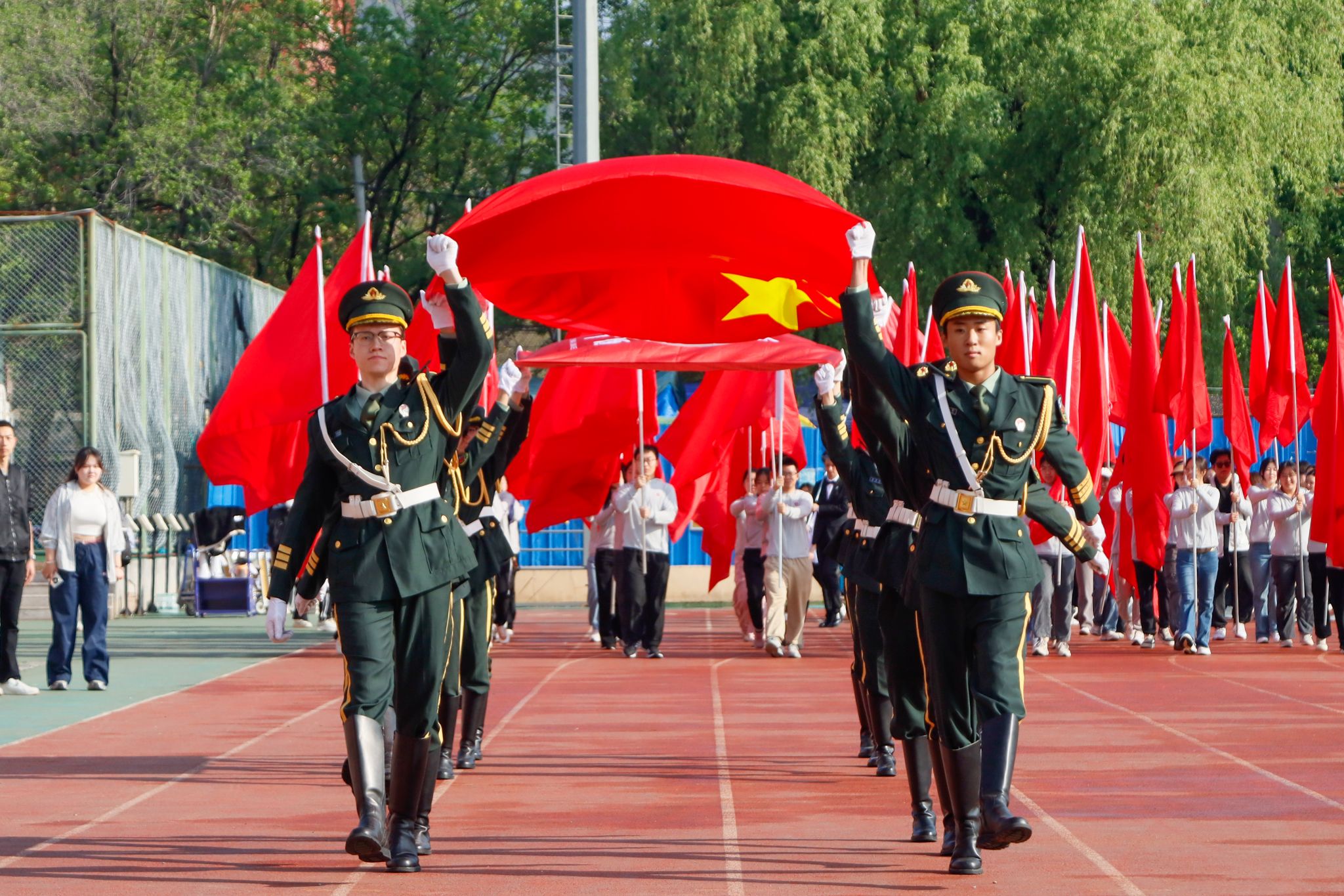 在庄严的进行曲中,国旗护卫队步履铿锵,护卫国旗和校旗率先入场。各学院的方阵队紧随其后依次入场,高举的旗帜在风中飘扬,引领着整齐的队伍,多样丰富的表演背后,是法大学子的创意与活力。今年,校友方阵人数创下历史新高,当校友们领着“小小法大人”,将一个个彩色的气球放飞到空中,气氛也随之推向了高潮。