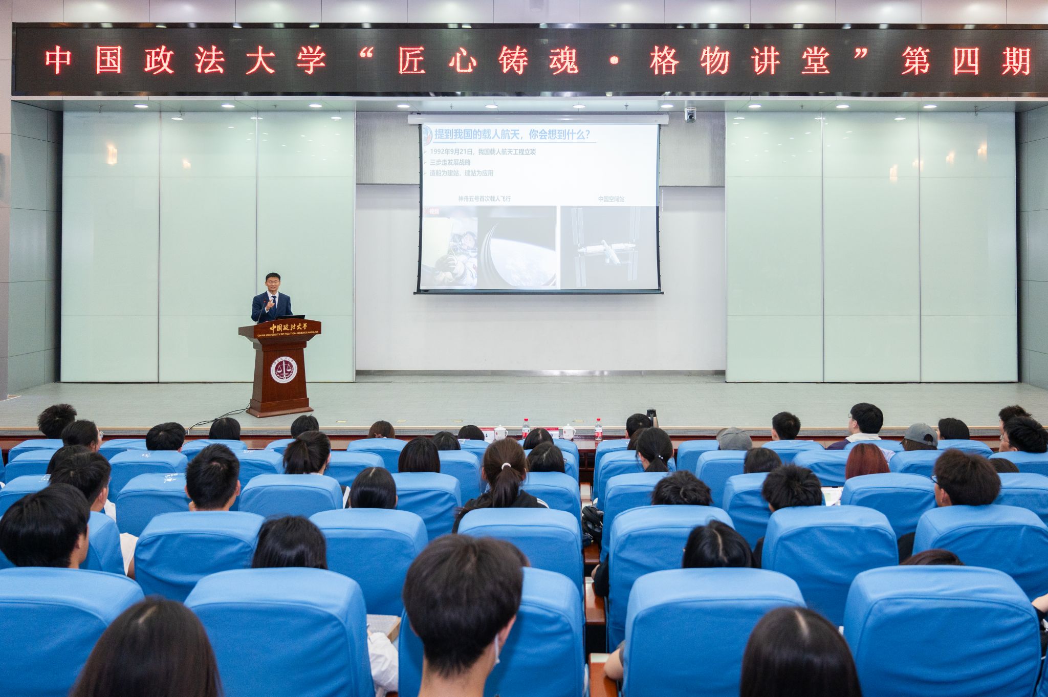 桂海潮首先介绍了我国载人航天工程概况,点燃了同学们对我国航天事业蓬勃发展的自豪感,更激发了大家对科学探索的热情。他特别提及了中国航天人的精神传承,向同学们诠释了国家科研人才应该具备的坚韧品格。无论在校园课堂,还是科研一线,抑或是万里太空,航天人始终秉持攻坚克难、守正创新的态度,时刻保持对航天事业的敬仰。每一次突破,每一项纪录,都是航天智慧的结晶,也是拼搏奋斗的最佳注脚。最后,桂海潮表达了对中国空间站未来发展的期待与祝愿,激励法大青年学子坚定胸怀天下的远大理想,秉持格物致知、脚踏实地的治学精神。