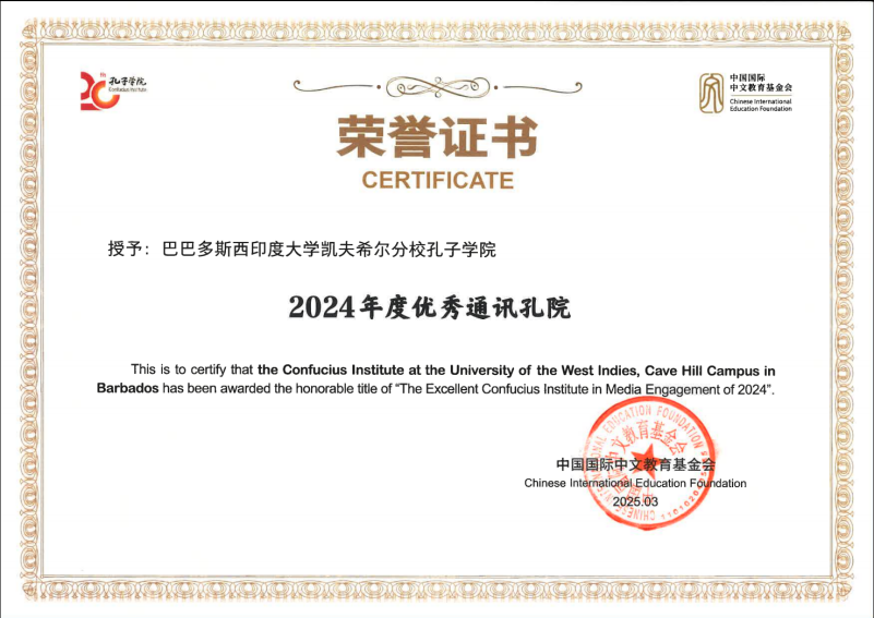 2025年3月,我校共建巴巴多斯西印度大学凯夫希尔分校孔子学院(以下简称“巴巴多斯孔院”)荣获“2024年度优秀通讯孔院”。在中国国际中文教育基金会综合评估的全球499所孔院中,巴巴多斯孔院成为荣获该荣誉的61所孔院之一。这是对巴巴多斯孔院过去一年新闻报道工作的高度肯定,也是对继续扩大孔院品牌影响的极大鼓励。