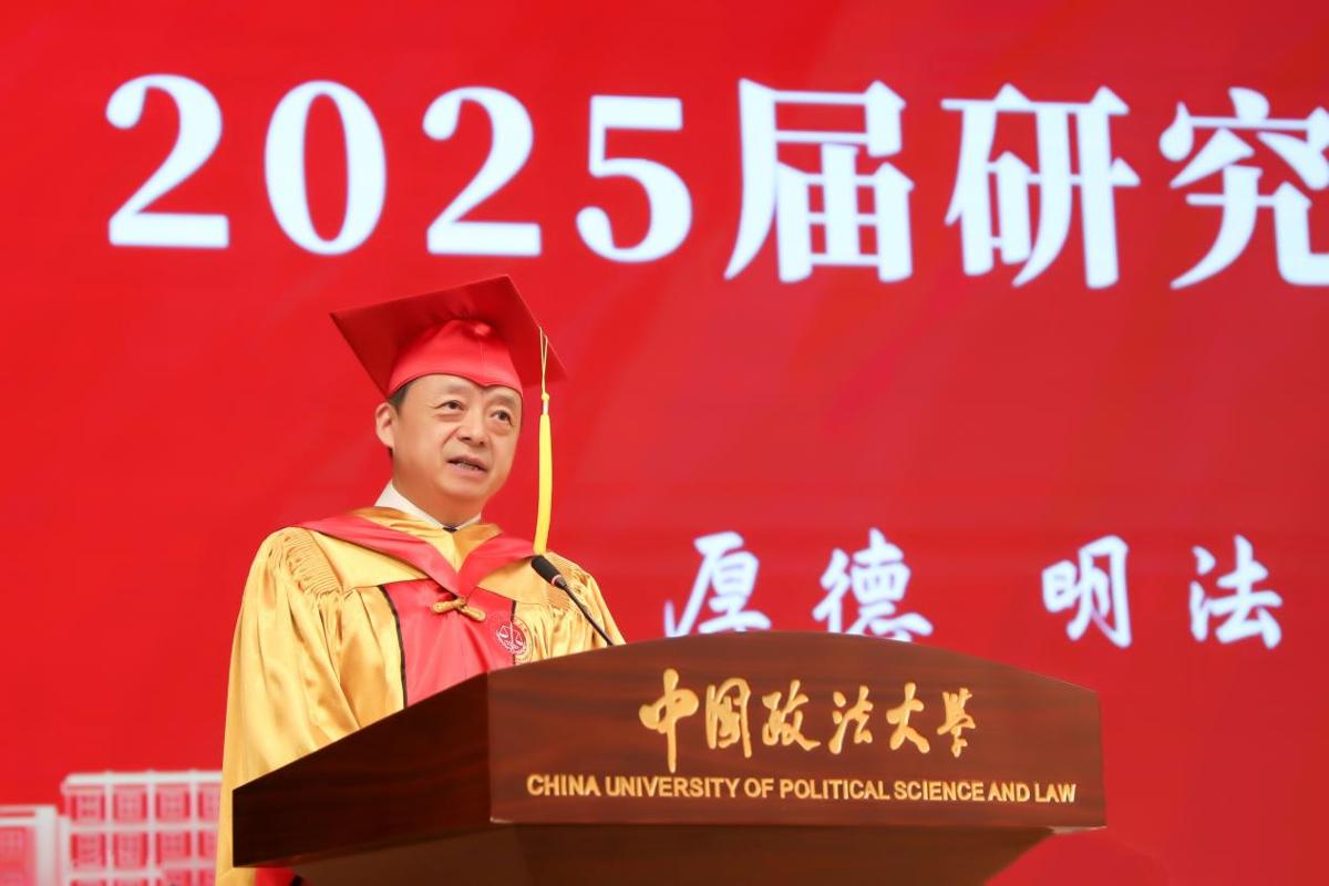 马怀德在致辞中向顺利完成学业的全体毕业生表示最热烈的祝贺,向悉心培育的导师和全体教职员工致以最诚挚的感谢。他回顾了2025届研究生毕业生们共同经历的重要时刻,并勉励同学们作为新时代壮阔征程的参与者,要深耕理想、创造未来。一是静水流深,要在时代的长河中沉淀信仰的力量。要心怀“国之大者”,将个人理想融入强国建设、民族复兴伟业,在纷繁世界中葆有沉稳的力量,以理性光芒,照见法治的恒久价值,践行法大人的良知与信仰。二是滴水穿石,要在浮躁多变的环境中修炼专注的心境。要以沉稳专注的心态,保持清醒、保持节奏、保持定力;要以一颗恒心深耕理想,心无旁骛、持之以恒,脚踏实地、久久为功。三是敢为波涛,要在变革的洪流中肩负责任担当。要以勇气破局、以担当立世,投身时代前沿,以专业、创新、人文、法治为根基,在服务国家社会的实践中,肩负起法大人的责任担当。四是百川归海,要在浩渺的大海中涵养博大的胸襟。要以法治信仰守护国家与人民,在时代洪流中做“破壁者”,在人生的长河中因势而谋、顺势而为,在广阔实践中涵养博大胸襟、创造无限未来。
