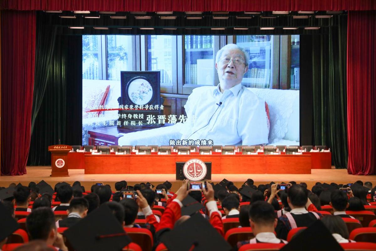 典礼开始前,“人民教育家”国家荣誉称号获得者,我校终身教授、研究生院首任院长张晋藩先生通过一条视频为毕业生发来祝福,寄语同学们要厚植家国情怀,不断进取、坚持奋斗,以强健的体魄和担当精神为全面推进依法治国作贡献。