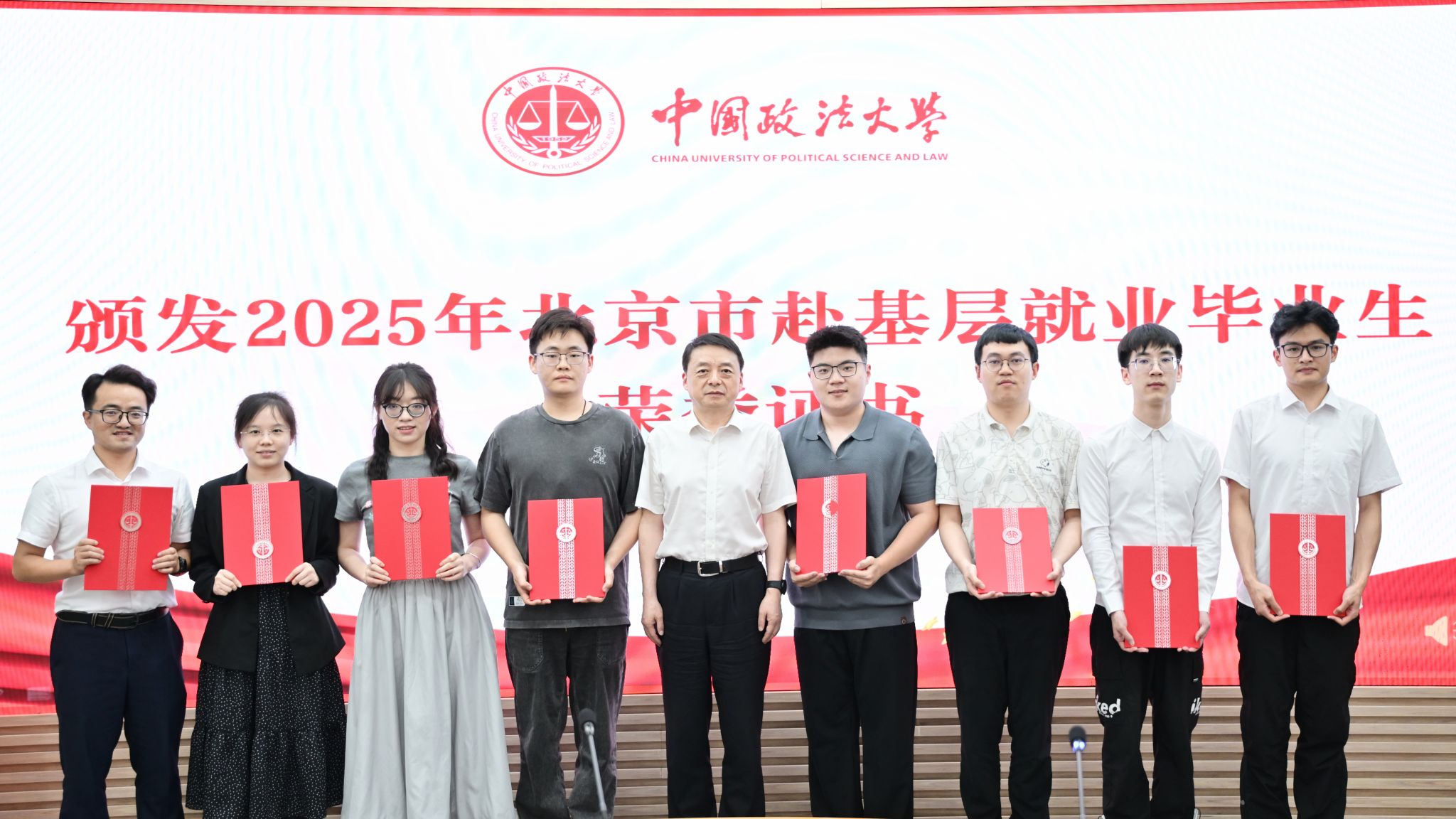 马怀德为即将赴基层就业的毕业生代表颁发了北京市赴基层就业毕业生荣誉证书。赴基层就业毕业生代表纷纷交流发言。