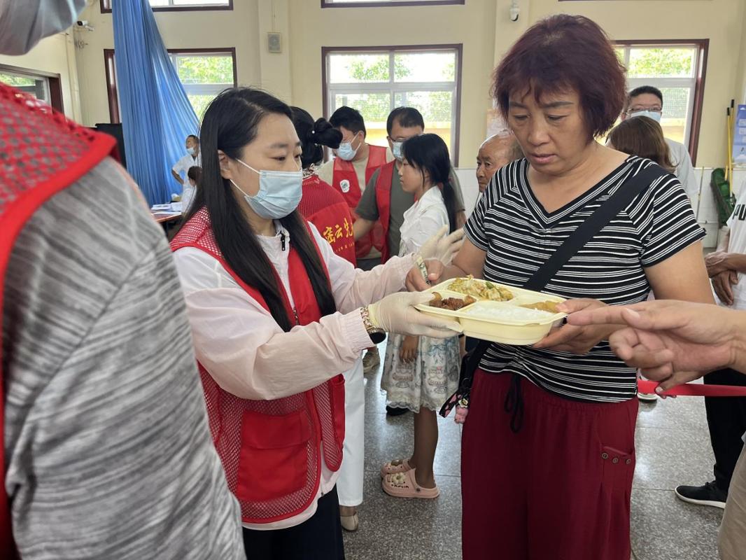 (于佳作为安置点第一组组长带领组员为灾民发放餐食及饮品)