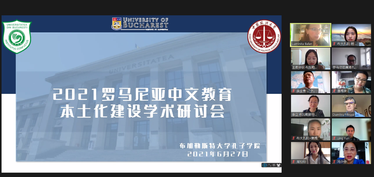 (特约通讯员 杨米娅)罗马尼亚时间6月27日上午9点,由我校共建罗马尼亚布加勒斯特大学孔子学院、布加勒斯特大学外国语学院东方语言文学系中文专业主办的“2021罗马尼亚中文教育本土化建设学术研讨会”顺利召开。罗马尼亚布加勒斯特大学前校长米尔恰·杜米特鲁(Mircea Dumitru)教授、北京语言大学刘珣教授、吴应辉教授、辽宁师范大学李宝贵教授受邀出席了本次研讨会。中罗两国教育界人士、欧洲汉语教学协会的汉学家、中东欧孔子学院的汉语教师等六十多人参加本次研讨会。