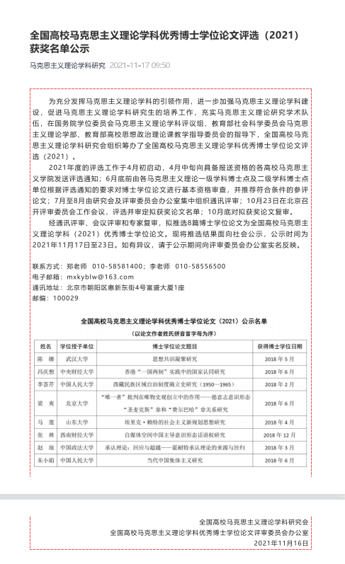 此次获奖是我院学生首次入选,彰显了我校马克思主义理论学科研究生的科研水平和创新能力,也表明我院在研究生培养质量方面实现突破。今后,学院将进一步加强卓越马克思主义人才培养及质量保障体系建设,深化教学改革,鼓励学术创新,在拔尖创新人才培养上取得更大成绩。