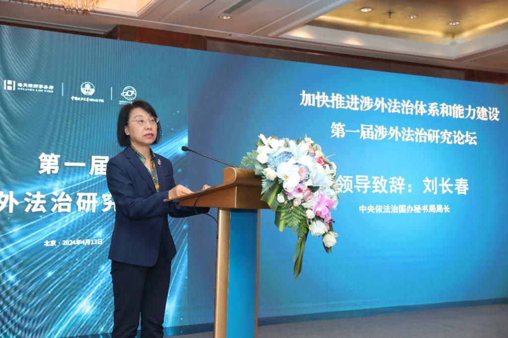 刘长春代表中央依法治国办秘书局对论坛的举办表示热烈祝贺,并强调中央依法治国办、司法部在习近平法治思想的指引下,坚持和加强党中央对涉外法治工作的集中统一领导,加快完善涉外法律法规体系,深化法治领域交流合作,加强涉外执法和司法实践,提升涉外法律服务能力以及加快培养高素质涉外法治人才。希望涉外法治研究基地深入学习贯彻习近平法治思想,立足学科优势和研究专长,坚持正确政治方向,加强涉外法治基础理论和应用对策研究,一体贯通推进理论研究和人才培养工作,讲好新时代中国法治故事,多出高质量研究成果,更好服务党和国家对外工作大局。刘长春表示,中央依法治国办秘书局将一如既往支持研究基地的建设发展。