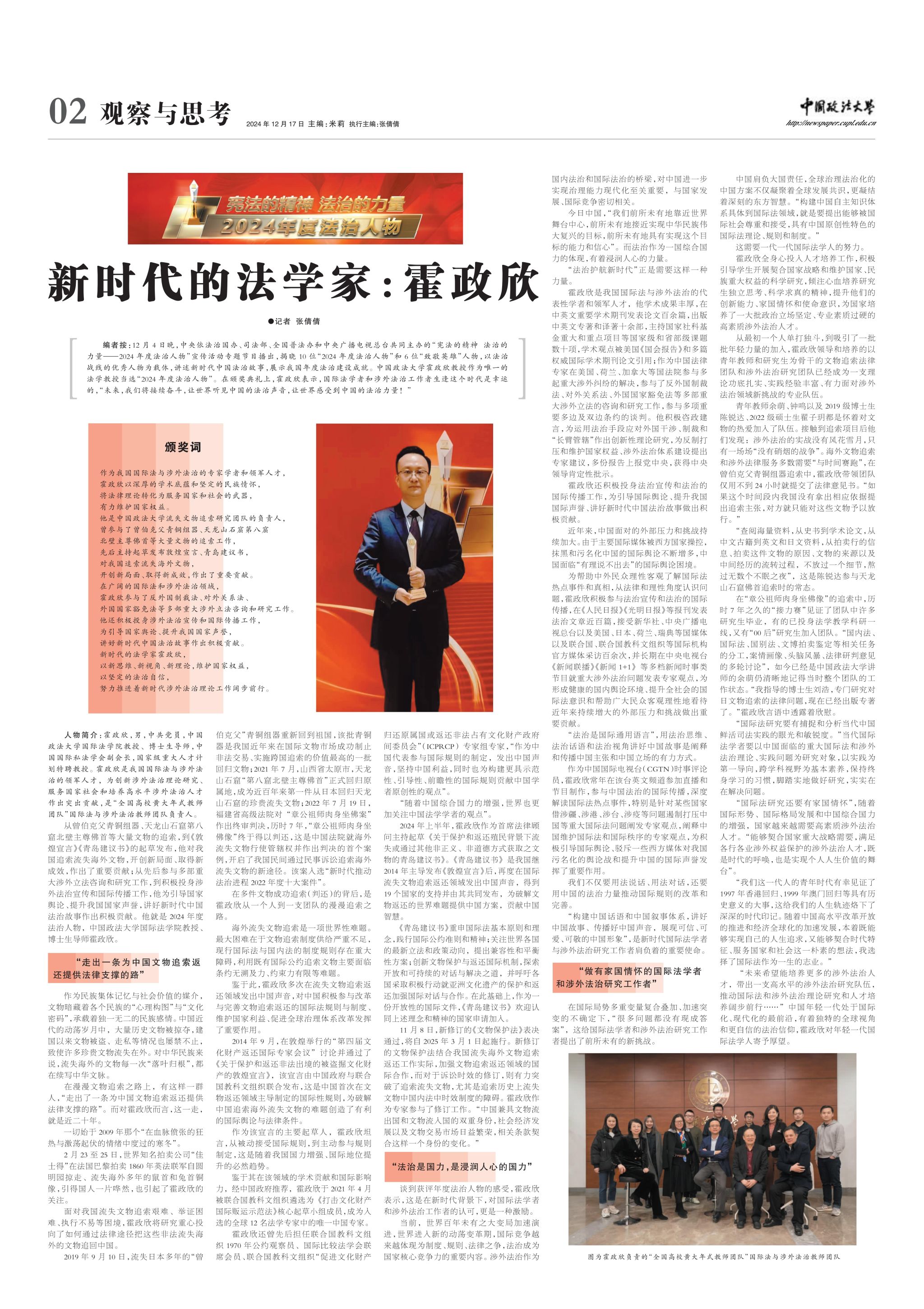 谈到获评年度法治人物的感受,霍政欣表示,这是在新时代背景下,对国际法学者和涉外法治工作者的认可,更是一种激励。