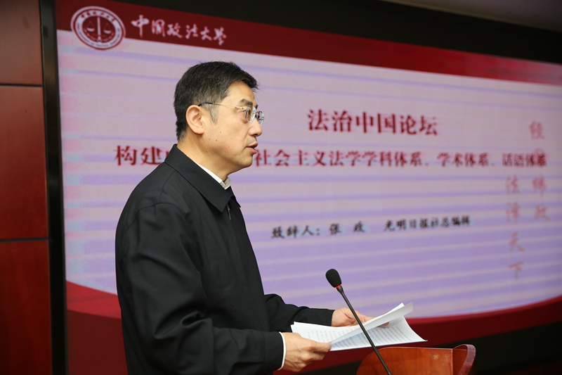 习近平总书记在党的十九大报告中指出:“全面依法治国是中国特色社会主义的本质要求和重要保障。”光明日报社总编辑张政致辞说,“全面深化改革这艘航船,需要法治的护航;中国特色社会主义市场经济这条奔腾不息的河流,需要法治堤坝的保护;改革开放近40年的发展成果,需要法治的守卫。”他特别从坚持马克思主义的指导、吸收国外优秀文化成果、吸收国外优秀文化成果三个方面,针对构建中国特色社会主义法学话语体系提出了建议。
