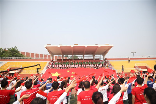 随后,《我和我的祖国》这首熟悉的旋律在法大附属学校小朋友们的童声中徐徐展开,身着各自民族服装的少数民族同学从主席台两侧奔向赛道中央,用舞蹈表达对祖国的深情。真挚的歌声瞬间点燃了在场师生的热情,大家掩饰不住心中的喜悦和激动,挥舞着手中的国旗,跟着一起哼唱,用真诚的歌声唱出对伟大祖国的热爱与美好祝福,尽情抒发着心中的骄傲与自豪。
