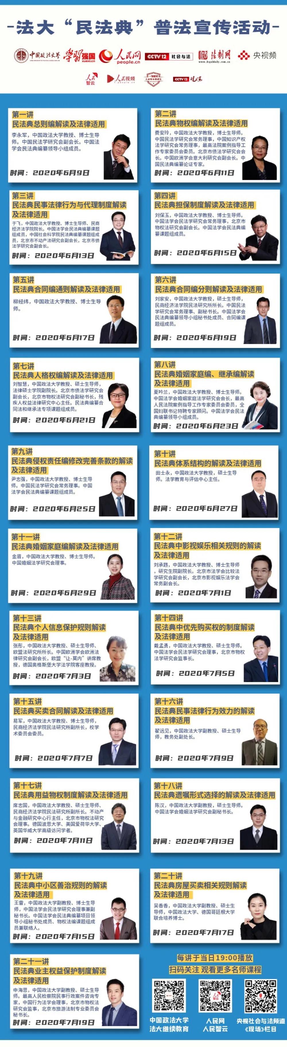 活动分别围绕民法典总则编、物权编、合同编、人格权编、婚姻家庭编、继承编和侵权责任编解读及法律适用展开,同时兼顾大众关注的法律问题讲解,计划讲授21期课程。