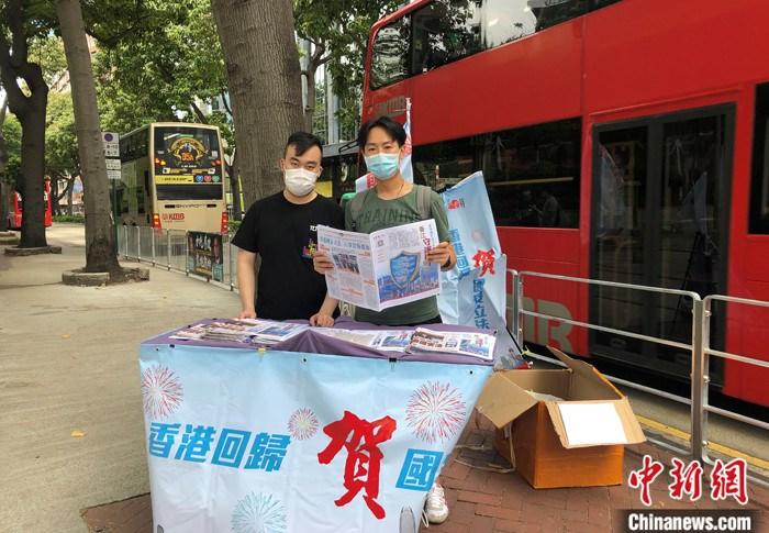 (7月1日,因疫情尚未返校的北京清华大学港籍学生陈贵和(右),与其他尚未返回内地高校就读的港生一起在香港街头“摆街站”,向市民宣介刚通过的香港国安法。 中新社发 受访者陈贵和 供图)