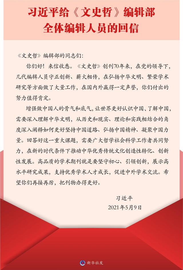 习近平给《文史哲》编辑部全体编辑人员的回信。 新华社 发
