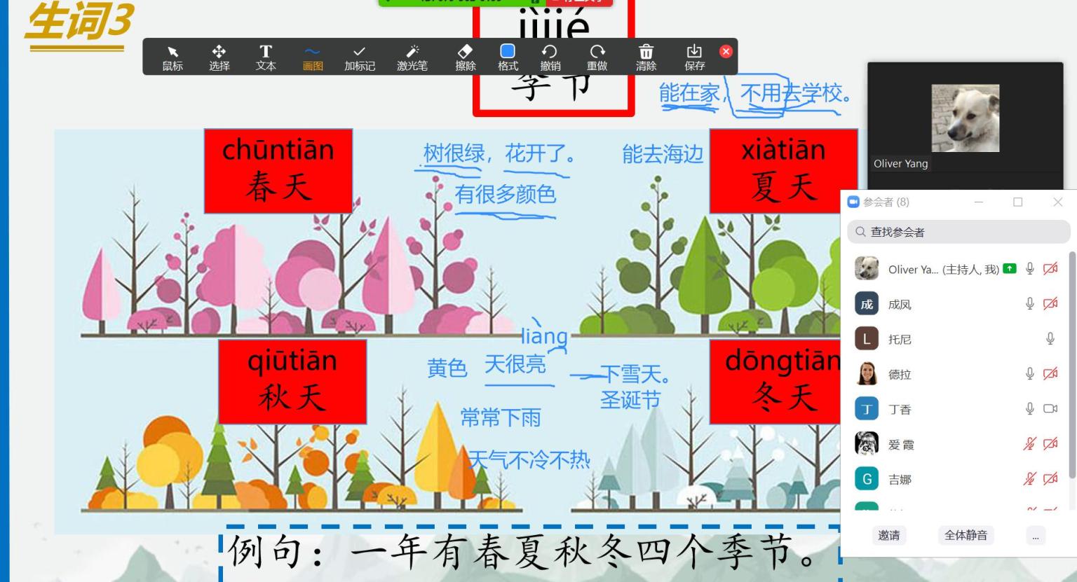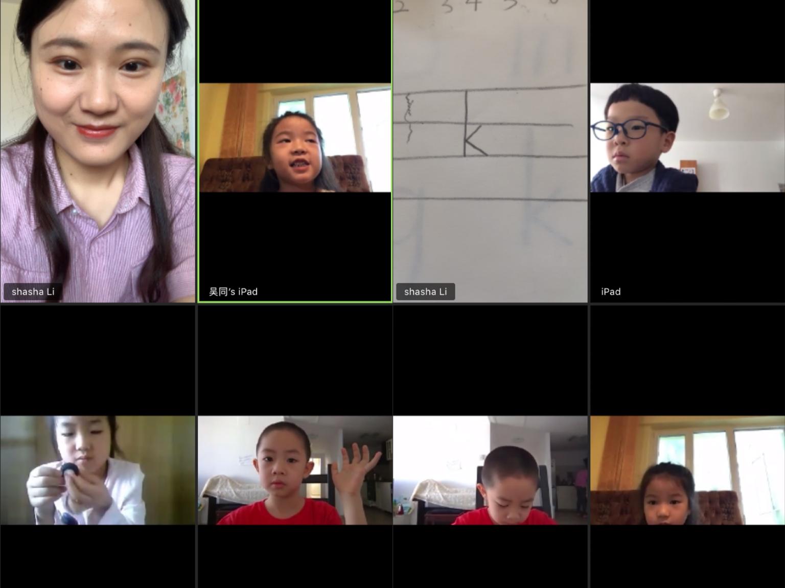 面对低龄的汉语学习者们,除了家长要付出一定的精力以外,我们的汉语教师更是一刻也不敢松懈。利用图片、歌曲、动画、视频等更多的网络资源,抓住孩子们的注意力,努力提高教学效率。课后的作业自然也不能少,书写汉字,发送语音,形式新颖多样,学生们乐此不疲!不再有教具的辅助练习?没问题!家里随手抓来的物品同样可以进行操练!不再有机会练习口语?不存在!话题主动权通通在学生身上,张口就来!不再有汉字书写练习?没关系!Zoom白板共享功能单击鼠标即可解决!不再有百分之百的注意力?不可能!明确的课堂纪律与面对面授课一样严格!