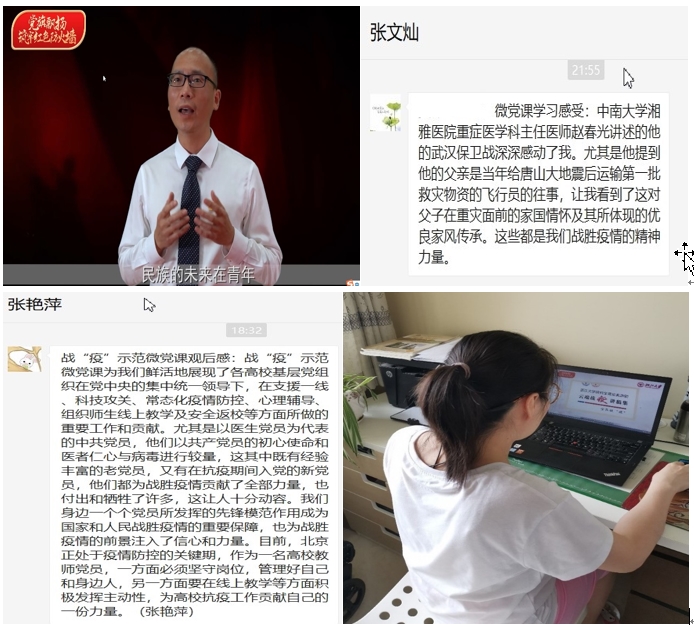 学院党委组织各支部开展“迎党的生日、讲战役故事、悟初心使命”组织生活会。各支部成员纷纷分享了身边的战疫故事,讲述了战疫的切身体会。例如,学院党委副书记、马克思主义中国化与国情研究所党支部书记吴韵曦参与社区党员先锋岗值勤三个多月,协助社区工作者开展防控工作,经历了不同的时期,应对了不同的状况。本科生党支部党员阿迪拉分享了自己在社区当志愿者协助社区基层干部,为居民收集每日体温、帮他们采购蔬菜以及各类生活用品的经历,谈到“一方有难八方支援”,疫情的胜利需要举国上下团结一心;党员肖立旭讲述了自己参与社区排查外出返乡人员的经历,社区办公室的老党员们主动承担起排查有疫情严重地区返乡人员的楼栋,将其他相对安全的楼栋留给大学生党员,让他体会到了党员之间的互相关心和爱护。