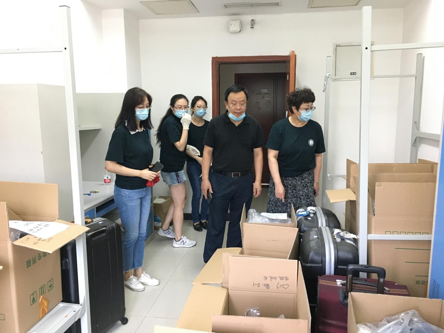 7月13日下午,副校长时建中来到国际教育学院来华留学生及港澳台侨学生宿舍,检查毕业生行李打包邮寄工作。在物品整理现场,时建中通过视频与毕业生亲切对话,祝贺学生顺利毕业,同时感谢学生对学校工作的理解与支持;他亲切慰问正在打包整理的工作人员,并且对大家细致的工作表示赞许。院长许兰、副院长许丹陪同并对物品的整理、打包、装箱、寄存、邮寄等工作流程一一介绍。