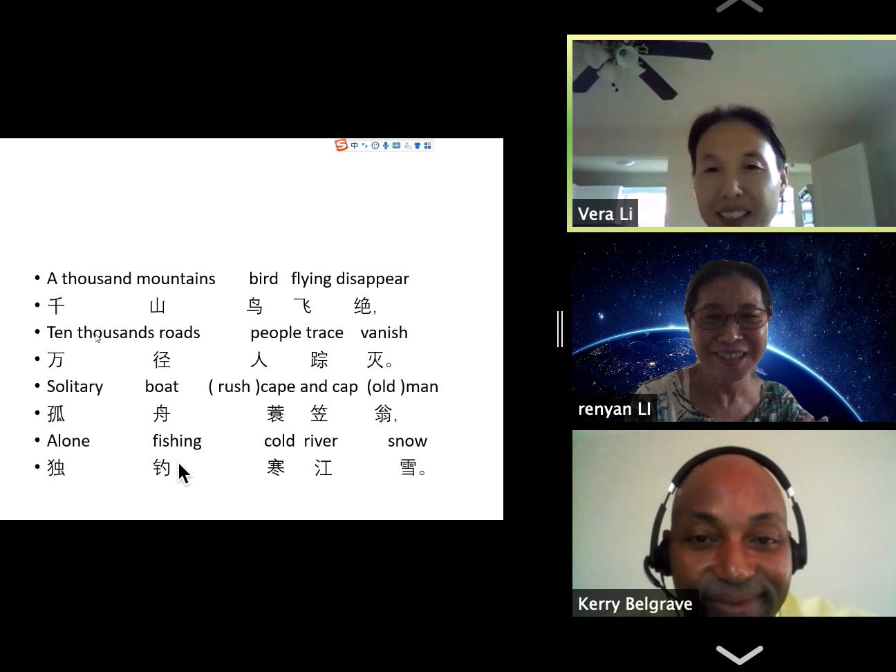 活动第一部分是 “中国山水田园诗”主题讲座。主讲人李秀丽从风景如画、触景生情和托景言志三个类别、从文道美和立意美两个角度出发,分析了杜甫的《江畔独步寻花》其六和《绝句四首》其三、李白的《静夜思》和柳宗元的《江雪》。她通过引导与会者比较许渊冲和秦大川译文,说明了杜甫“窗含西岭千秋雪”和“门泊东吴万里船”两句诗行的立意。《江雪》这首诗引发了巴巴多斯诗人的踊跃发问和讨论。有人认为,该诗描绘了老渔翁的艰苦生活;有人提问,怎样判断诗中的雪是falling snow还是fallen snow?诗人们展开想象,参会众人热烈讨论,诗人对如何欣赏中国传统诗词、中国传统诗词的意境有所了解。