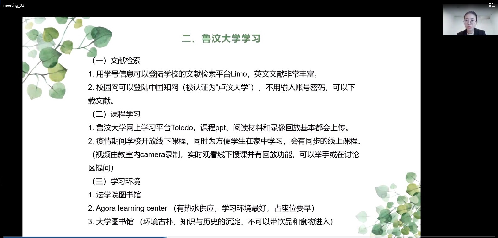 张灿于2020年上半年前往鲁汶大学进行一学期的交换学习。她主要从行前准备进行了分享,包括英语成绩准备、签证材料准备等内容。她提醒各位同学,申请签证是一个漫长且复杂的过程,希望大家做好心理准备。签证申请是一个锻炼沟通能力的过程,建议同学们高度重视,做好签证准备和目前欧洲法学习的时间分配。建议同行的同学分工协调相互帮助,共同完成签证的材料准备。张灿还谈到了她在鲁汶的学习生活,表示鲁汶的课业难度较大,考试的形式包括口试和笔试,但相信师弟师妹们认真学习定会有所收获。