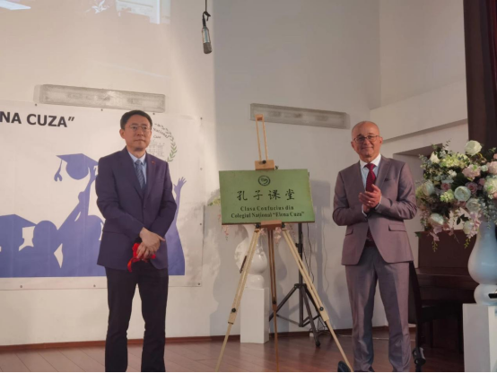 (特约通讯员 王迪雅)当地时间5月19日,我校共建罗马尼亚布加勒斯特大学孔子学院下设“埃列娜·库扎”国立学校(”ElenaCuza”NationalCollege)孔子课堂举行揭牌仪式,同时庆祝“埃列娜·库扎”国立学校建校190周年。中国驻罗马尼亚大使韩春霖、中国驻罗马尼亚使馆二等秘书李征博、罗马尼亚国家图书馆馆长乔罗亚努(AndrianCioroianu)、多尔日省议会主席瓦西里(CosminVasile)、多尔日省教育总督察约恩(Ion Daniel)、克拉约瓦市长瓦西列斯库(LiaOegutaVasilescu)、布大孔院罗方院长白罗米(LiminitaBalan)、布大孔院中方院长周佳磊等出席仪式,“埃列娜·库扎”国立学校师生以及各界友好人士参加活动。