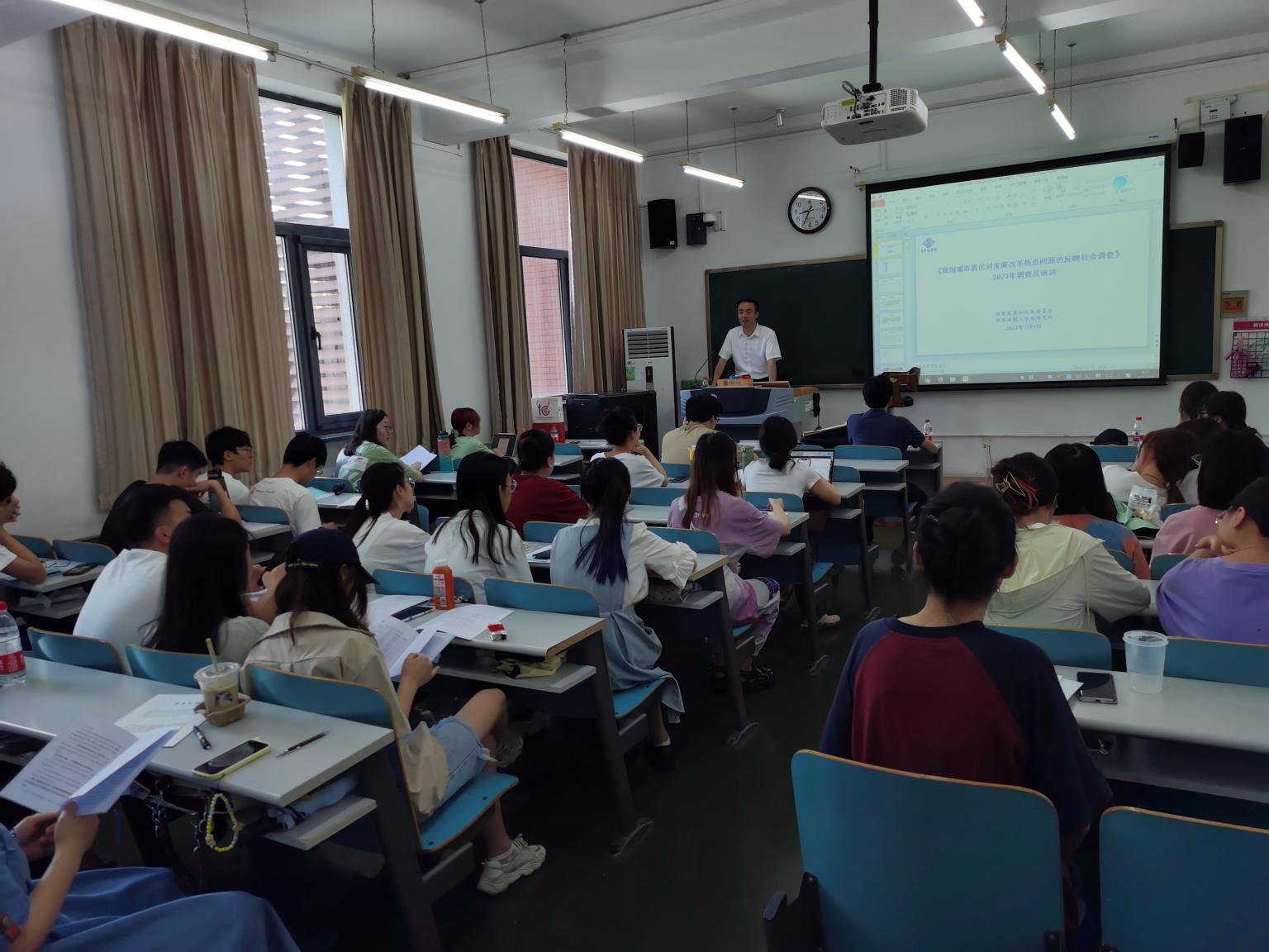 调查开始前,国家发改委经济体制与管理研究所社会调查研究室主任胡杰成、副主任赵春飞及刘建涵博士赴我校开展调查员培训。胡杰成针对调查的背景目的、流程要求、行为规范、注意事项以及实操细节为学生调查员进行系统讲解,而后学院组织学生至政法社区进行入户试调查。赵春飞与社会学院桑迪老师分别就经费使用、纪律要求、安全事项与调查细节为学生进行深入培训。