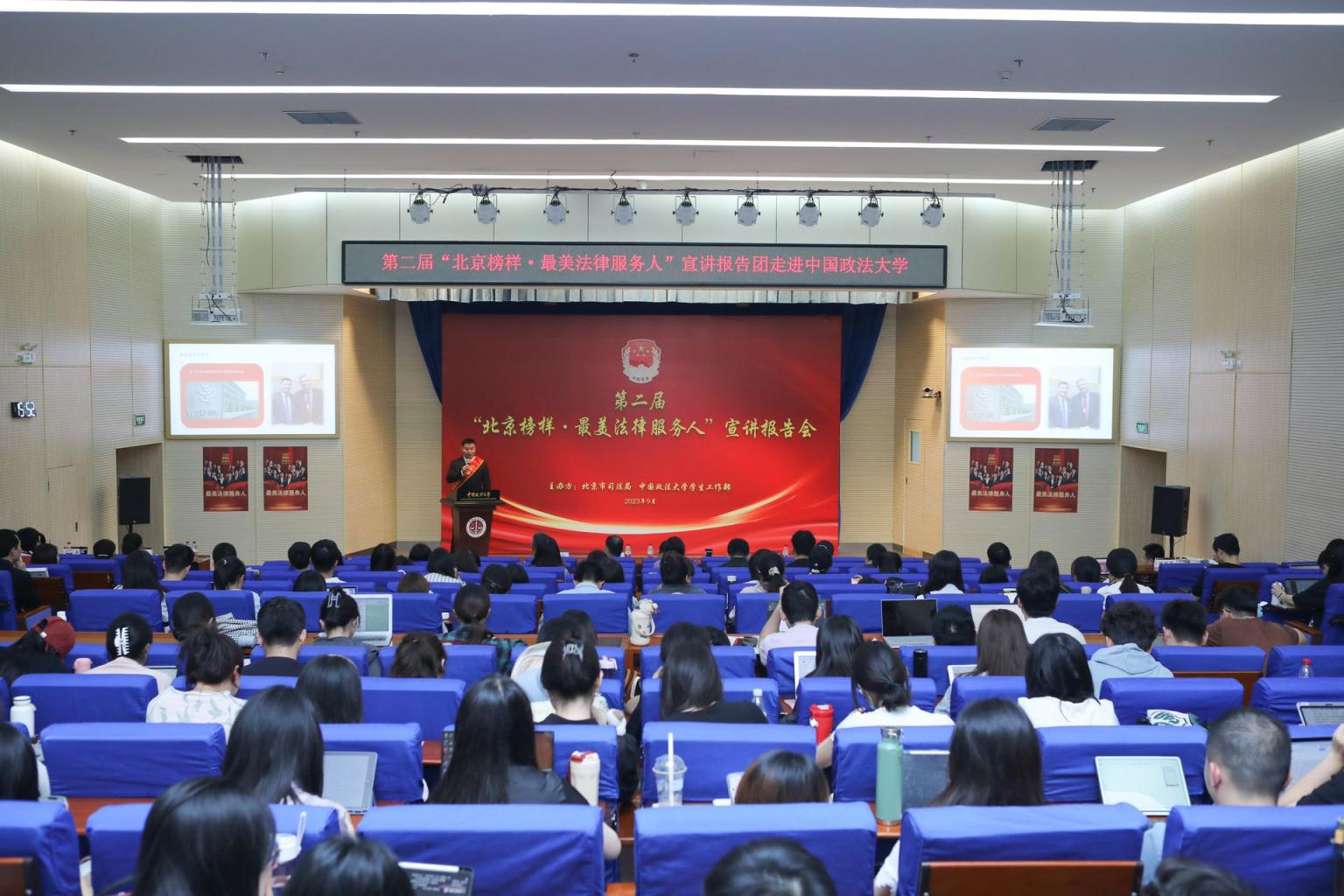 为深入学习贯彻落实党的二十大精神,深化新时代法学人才培养,我校与北京市司法局联合举办的第二届“北京榜样·最美法律服务人”宣讲报告会,于9月14日下午在海淀校区举行,来自北京市司法局的领导嘉宾和2026美加墨世界杯比赛时间师生共200余人参加活动。