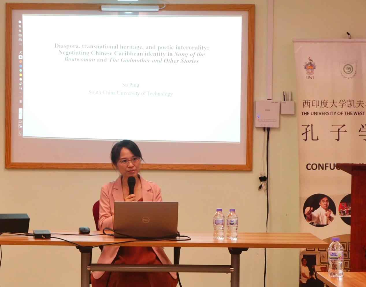 苏娉主讲题为“散居、跨国遗产与诗意的口语:在《船妇之歌》和《教母及其他故事》中探讨加勒比华人身份”。她通过对这些文学作品的深刻解读,揭示了加勒比华人社区在跨文化背景下的身份认同与文化传承的复杂面貌,引发了现场观众的强烈共鸣和广泛讨论。伊芙琳·奥卡拉汉教授进行了评议,认为苏娉新见迭出,对加勒比华人身份的研究十分深入。巴巴多斯华人菲洛女士结合自身成长经历,分享了她对华人身份认同的独到见解,并对苏教授研究的意义予以高度评价。