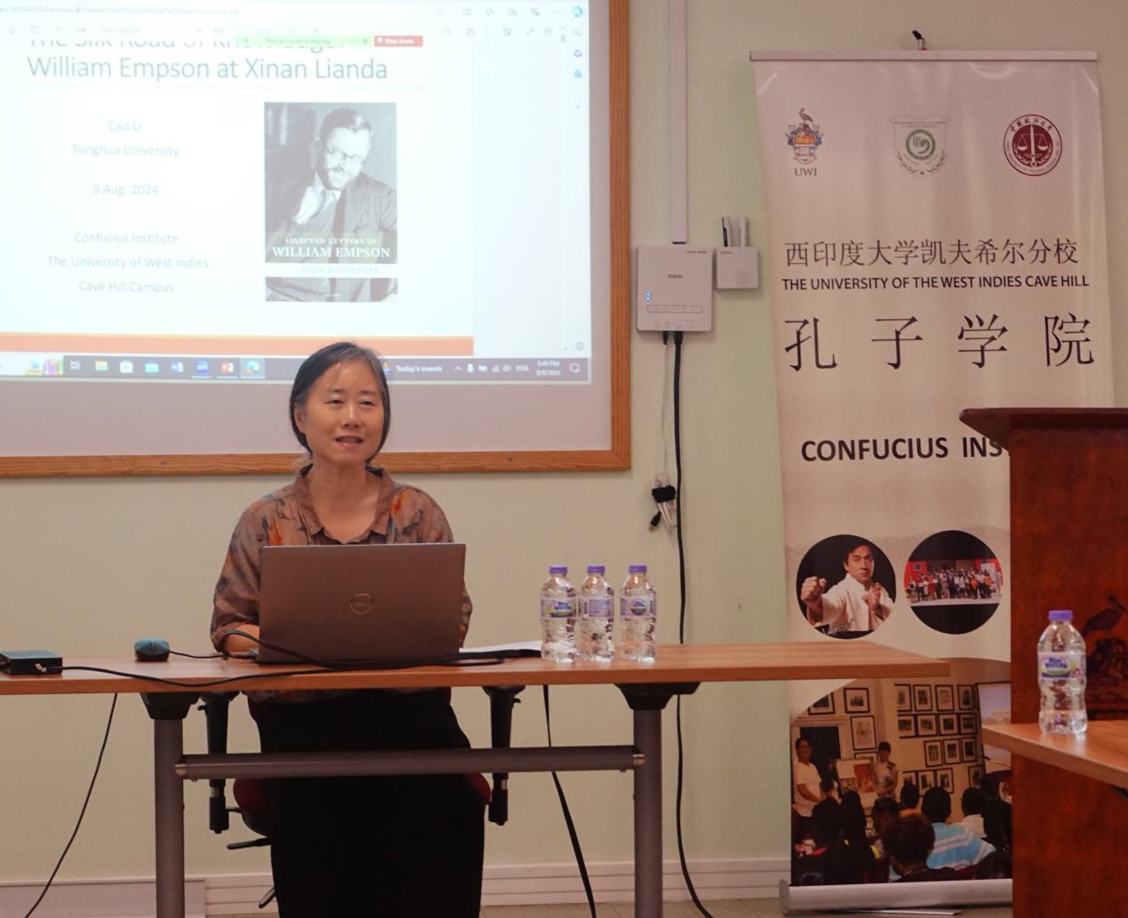 当地时间8月9日下午,我校共建巴巴多斯西印度大学凯夫希尔分校孔子学院(以下简称“巴巴多斯孔院”)成功举办第四期知行论坛。本期论坛特邀清华大学教授曹莉和华南理工大学教授苏娉进行了精彩的学术讲座。西印度大学凯夫希尔分校校长克莱夫·兰迪斯(Clive Landis)教授、副校长温斯顿·摩尔(Winston Moore)教授、荣誉教授伊芙琳·奥卡拉汉(Evelyn O’Calladhan)、巴巴多斯-中国友好协会会长德雷斯·沃瑞尔(Delisle Worrell)博士、前巴巴多斯驻华大使切尔斯顿·布拉斯怀特(Chelston Brathwaite)博士、巴巴多斯孔院中方院长聂露教授、外方院长大卫·布布利亚(David Bulbulia)、中国第六批援助巴巴多斯医疗队全体成员、巴巴多斯华人联合会秘书长菲洛·李(Philo Lee)、巴巴多斯-中国归国学者协会代表、西印度大学凯夫希尔分校教师、巴巴多斯孔院全体教师等共计50余人参加论坛。本次论坛由聂露主持。