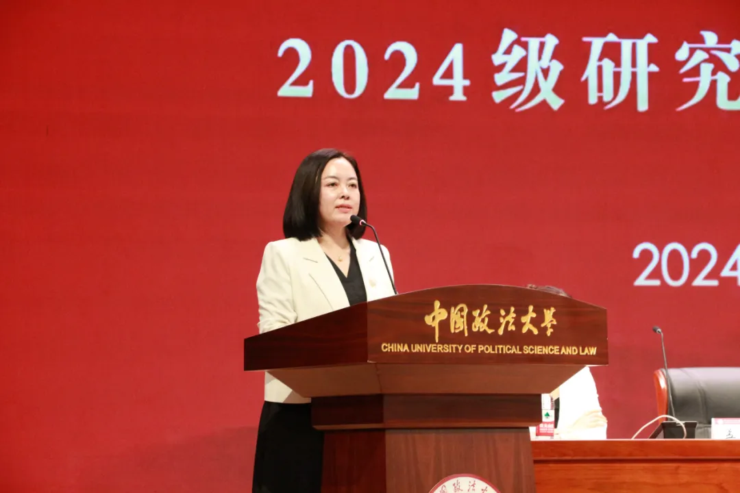 李蕊作为导师代表致辞,她热烈欢迎新同学们的到来,一起“遇见法大、情定民商”,开启研究生新征程。她表示在研究生阶段,同学们要努力实现从知识的输入者向输出者转变,具体有以下三点建议:一是脚踏实地、系统训练。通过大量专题研究提升法律推理、语言表达和逻辑思维等能力;二是仰望星空、兼容并蓄。以开放包容的心态,不断超越既有的知识体系去发现、去探寻;三是拥抱时代、质疑思辨。在静心读好圣贤书的同时,两耳多闻窗外事。她希望同学们能够“给时光以生命”,以梦为马、不负韶华!