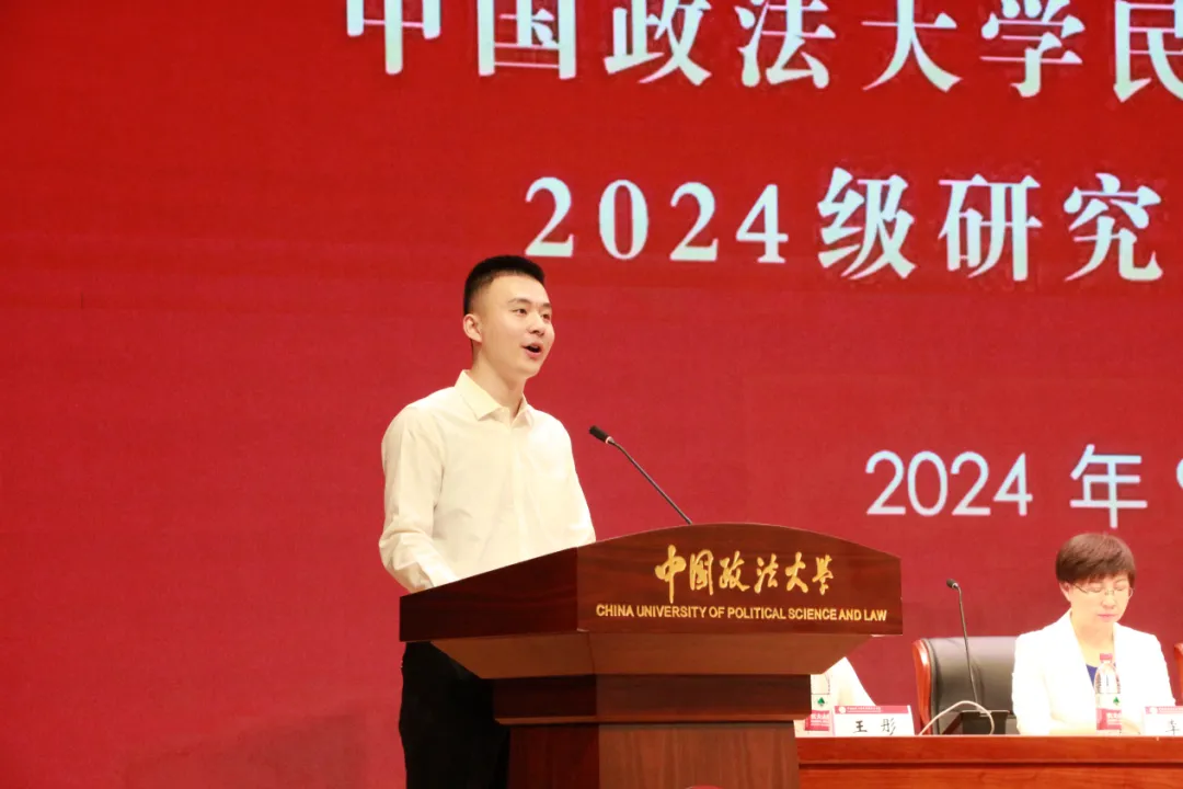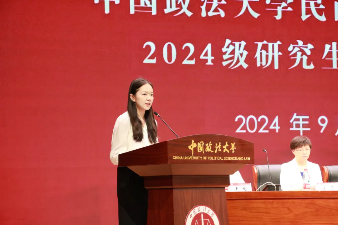民商经济法学院2024级硕士新生杨雁舒作为新生代表发言。她认为研究生阶段既是强化能力、拓宽视野的关键时刻,也是自我探索、自我超越的黄金时期。她号召同学们不负党和国家的殷切期望,秉持“治学修身,经世济民”的院训精神,以严谨的态度对待学术,以坚定的信念追求真理,以热情的心态拥抱生活,以奉献的精神回馈社会,立志成为堪当民族复兴大任的时代新人!