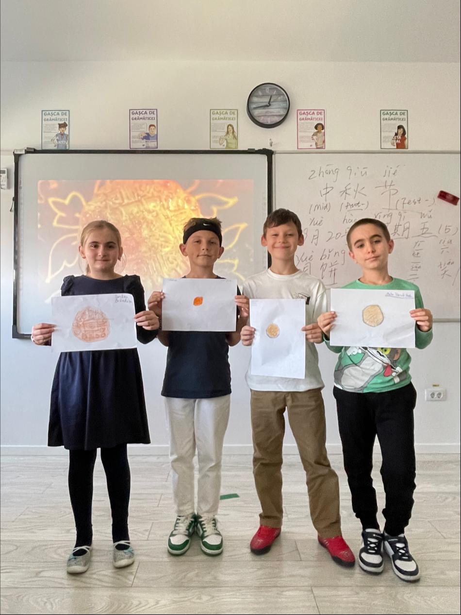 活动中,范笛详细介绍了中秋节的起源和发展,通过视频分享了中国不同地域品尝月饼的多样化习俗,以及人们对举家团圆、健康平安的美好祝愿。此次活动突出文化体验互动,同学们积极参与,画出了“我心中的月饼”,并表达了自己对中秋节的理解,小学部4年级B班的塞比(Semino Tiberiu)说:“因为中国有着悠久的历史,所以有许多不同的节日,每一个节日都是家人团聚的好时光。”初中部9年级的安德莉亚(Danalache Andreea)说:“月亮和月饼都是圆的,这意味着一家人在一起。”