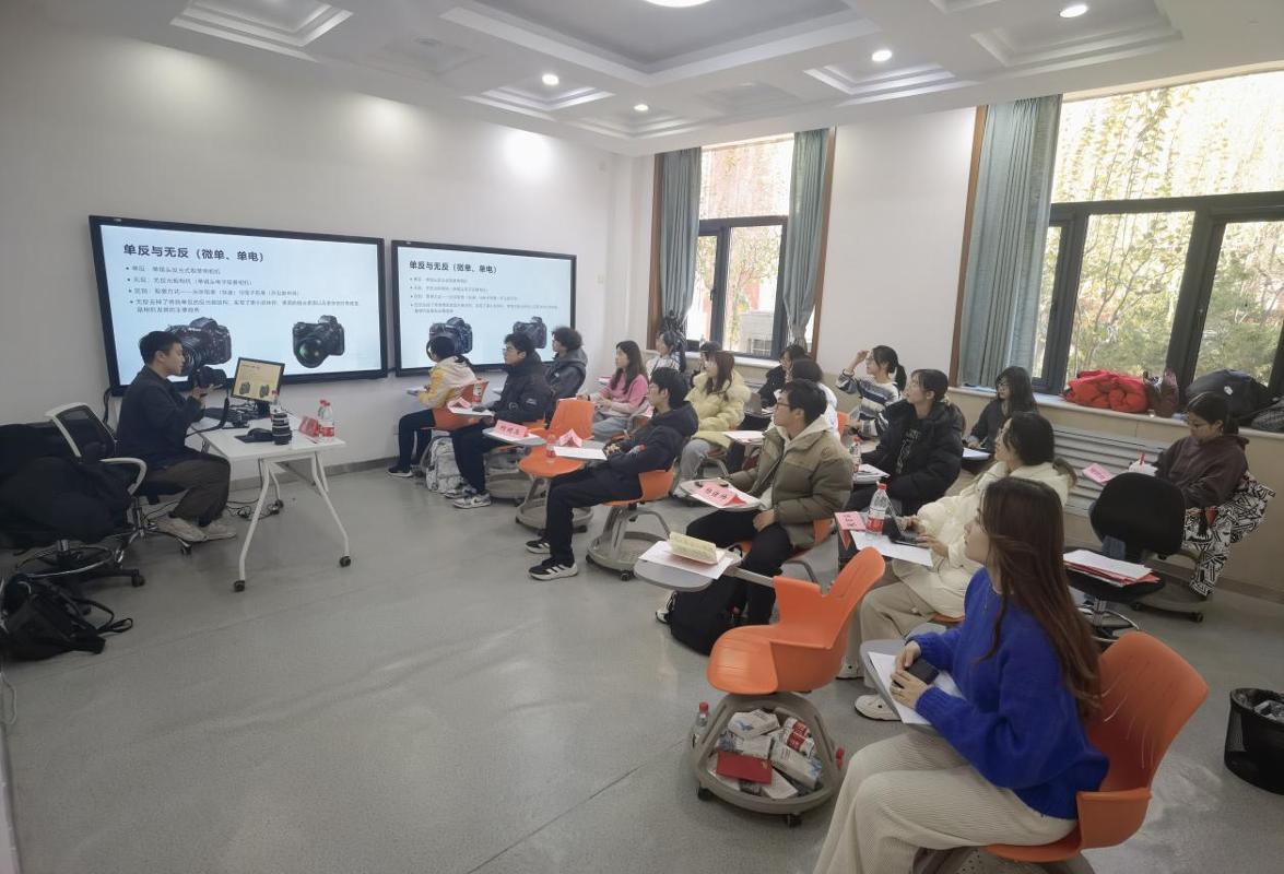接着,尹建峰向同学们介绍了三分法构图、对称式构图、引导线构图等摄影的构图技巧。尹建峰还扩展性地介绍了框架式构图、留白式构图、三角形构图等多种构图方法。同学们认真听讲,收获良多。
