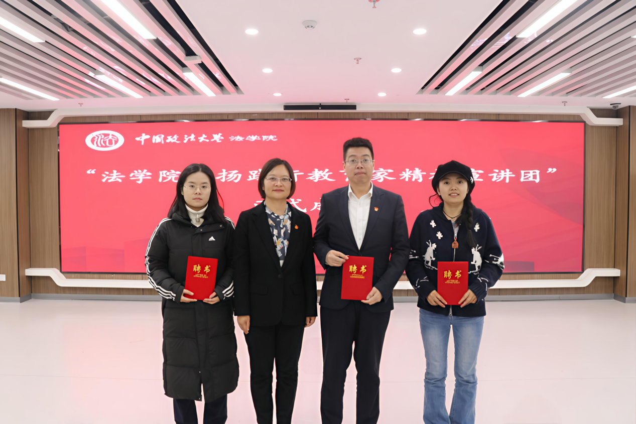 陈维厚宣读法学院关于成立宣讲团的决定,聘任张京凯为弘扬践行教育家精神宣讲团顾问,法律史学博士生赵佳菡等为宣讲团成员,王文英为宣讲团成员代表颁发聘书。