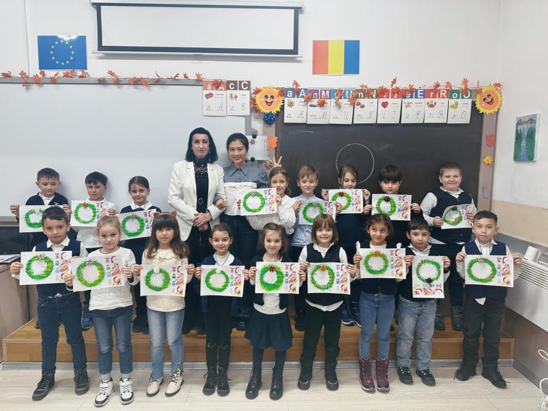 活动伊始,公派教师王宏介绍了圣诞节与中国春节的相似之处,指出它们都是一年之中家人欢聚的重要节日,体现了不同国家及文化对家庭与幸福的珍视。随后,王宏引导学生用中文跟读“圣诞快乐”,并教学生用水彩笔描红“圣诞快乐”的拼音和笔画,鼓励学生反复练习并尝试独立书写。最后,师生们用水彩颜料设计圣诞花环,绘制圣诞图画。课堂上,老师以学生的兴趣为出发点,将中文教学与罗马尼亚传统节日相结合,通过寓教于乐的形式增添课堂的趣味性与互动性。学生们边学边画,参与热情高涨,学习效果明显。