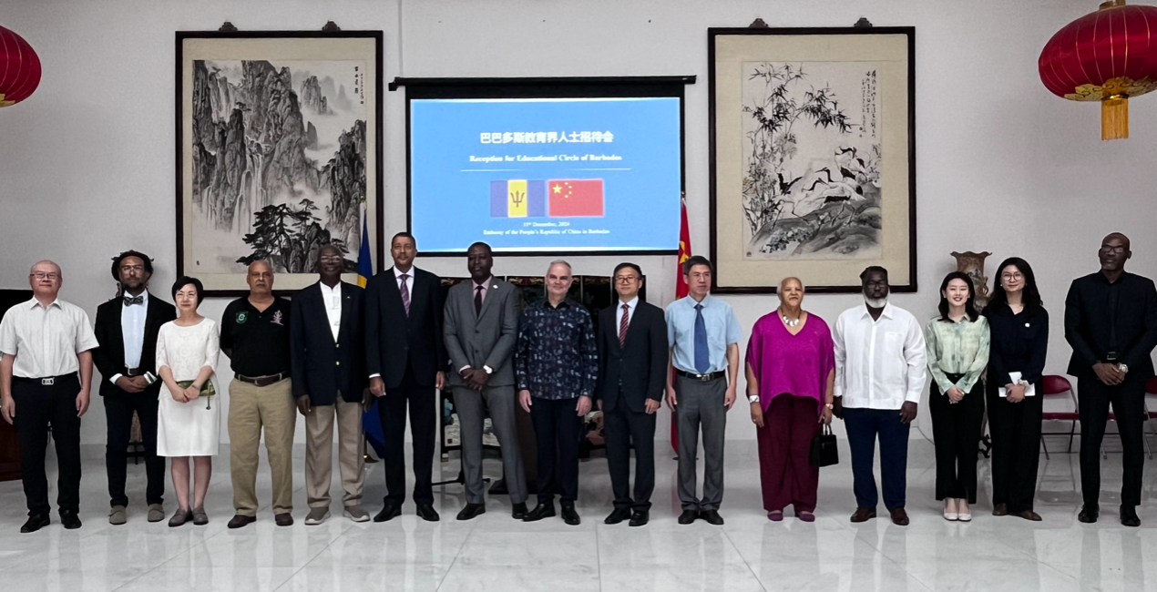 12月11日晚,中国驻巴巴多斯大使馆举办巴巴多斯教育界人士招待会,欢迎代表团一行,中国驻巴巴多斯大使馆代办黄新华、西印度大学凯夫希尔分校校长兰迪斯(Clive Landis)、加勒比考试委员会官员凯文·佩恩(Kevin Payne)等三十余人参加招待会。黄新华、毛彦成、兰迪斯先后致辞。他们从不同角度谈到了中国与巴巴多斯的教育交流和人员往来,重申促进中巴人民民心相通、文化交流与文明互鉴的重要意义。黄新华和兰迪斯高度评价巴巴多斯孔子学院在中文教学和文化交流方面作出的成就。