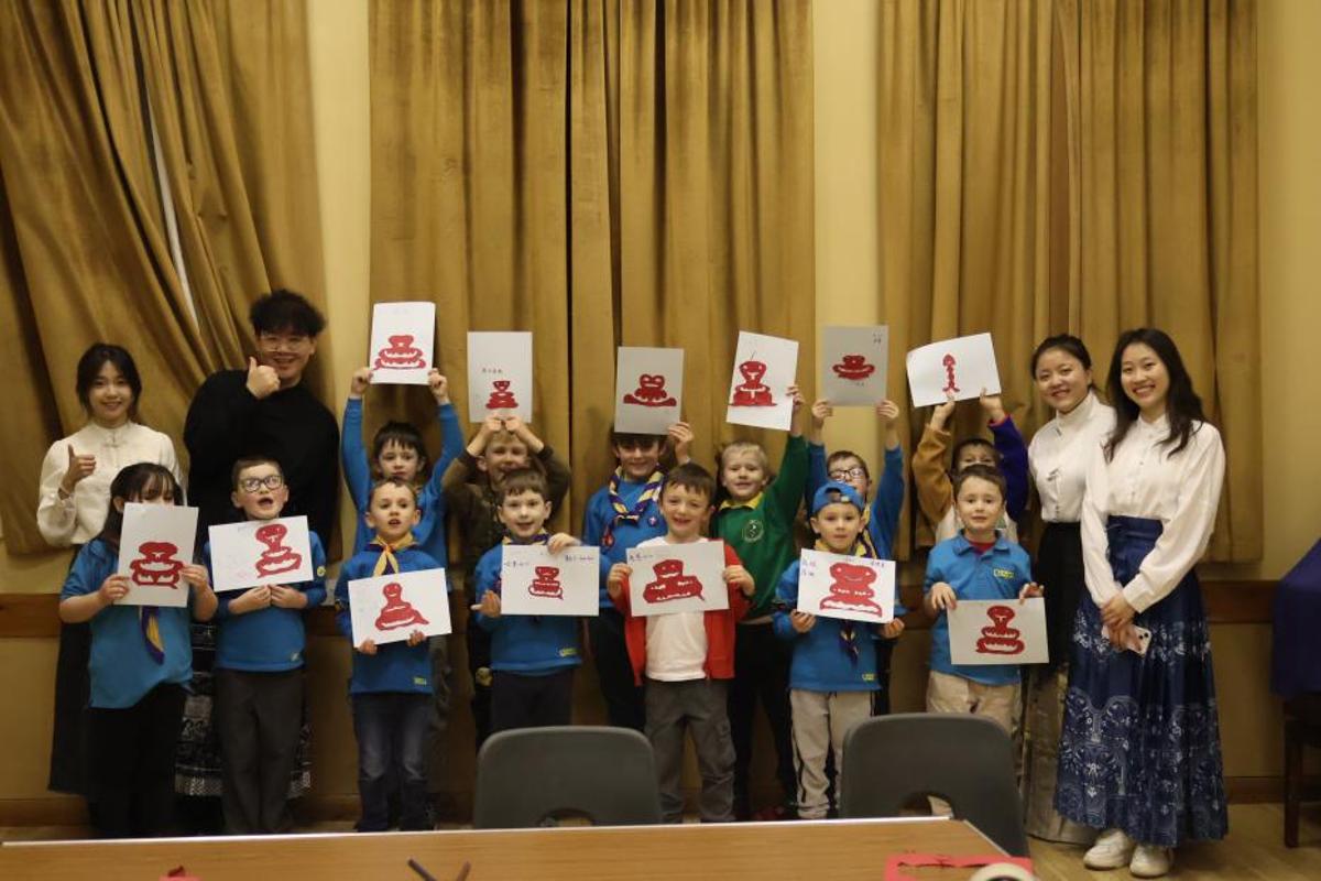 语言文化体验方面,汉语启蒙课堂通过情景对话教学,使学员掌握“新年好”“恭喜发财”等节日用语。女王罗马天主教小学(Our lady’s Roman Catholic Primary School)的老师评价:“视频教学结合实景演示的教学方式非常有效,各年龄段学生都能积极参与,课堂氛围十分活跃。”兰盖夫尼童子军领队凯蒂·科伯恩(Katie Coburn)特别指出:“动手制作环节让孩子们直观理解了汉字‘福’的吉祥含义,孩子们学得非常开心。” 另一位参与者补充道:“这不仅是一次文化体验,更是一次增进相互理解的机会。”