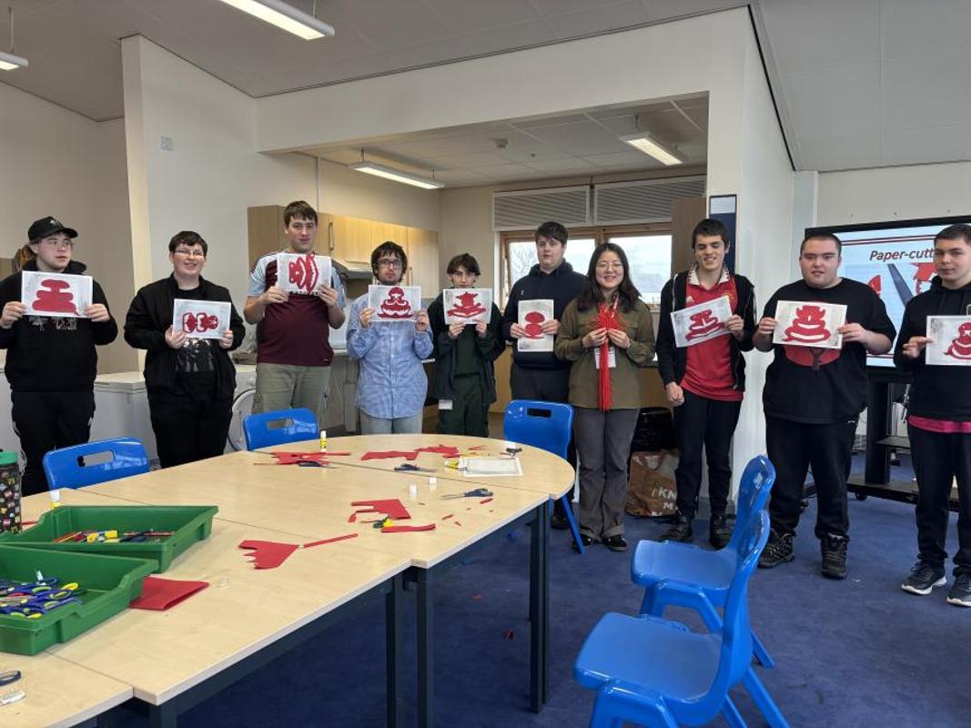 本次活动共设置12项特色文化体验项目,涵盖汉语启蒙课堂(Chinese Taster)、传统手工艺(黏土中国结、彩绘风筝、蛇年剪纸)、中国艺术体验(古筝二胡器乐表演、中国舞、中国武术、书法国画)等多个领域。在彭马奇诺小学(Ysgol Penmachno)的彩绘风筝工作坊中,教师通过问答互动的形式,向学生讲解了山东潍坊国际风筝节,并介绍了蕴含中国元素的风筝图案。此外,黏土中国结、生肖剪纸、灯笼制作等项目因其互动性强备受青睐,仅邦特特殊学校(Ysgol Bont)就完成了30余件剪纸作品。