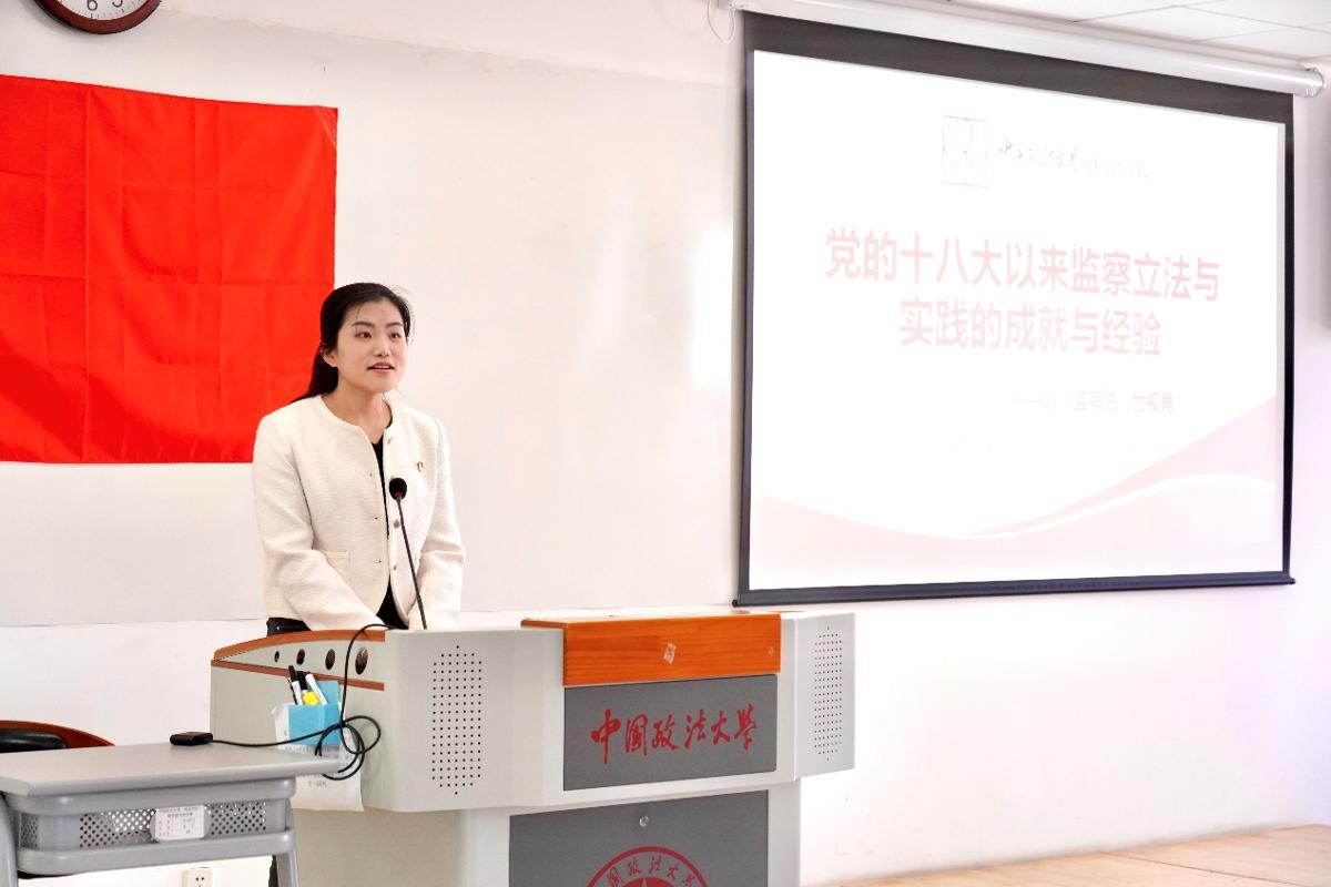 我校纪检监察学院“清风宣讲团”成员胡佳茵围绕《党的十八大以来监察立法与实践的成就与经验——以<监察法>为视角》作主题宣讲,详细阐述了党的十八大以来监察立法的理论创新、监察实践的主要经验、反腐倡廉的历史性成就,让大家深刻感悟到我国纪检监察体制改革的丰硕成果和法治建设的铿锵足音。