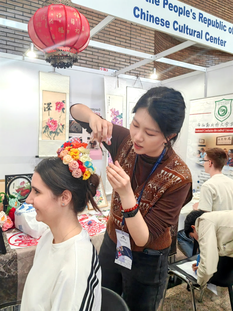 本次展览正值罗马尼亚迎春花节,布大孔院志愿者潘婧颖向游客们介绍了国家级非物质文化遗产——福建泉州的簪花文化。她详细讲解了簪花的历史发展和文化内涵,并展示了色彩斑斓的簪花发饰。许多年轻人被这一独特的“花”文化吸引,纷纷前来体验。在潘婧颖的帮助下,游客们头戴簪花围,化身为一个个春意盎然的“花仙子”。一位体验者笑着说:“我从来没有见过这么美的发饰,感觉自己变成了一位中国古典美人!”