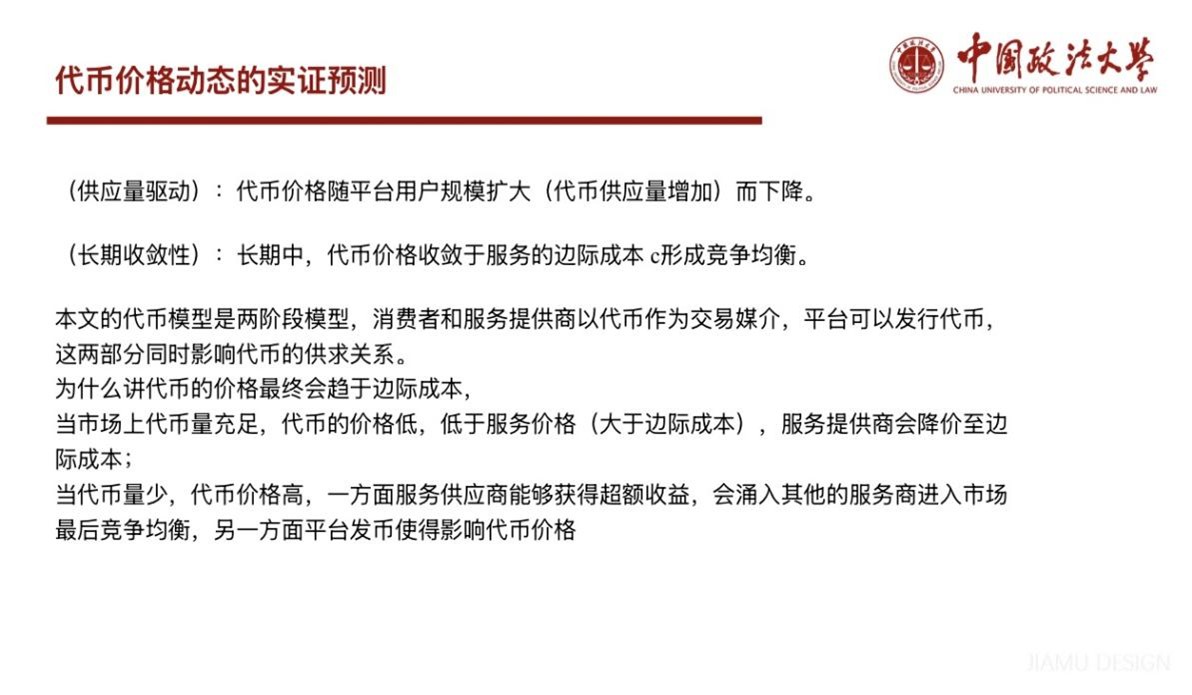 第三部分中,王超翔同学报告了如下内容:文章进一步探讨了代币化在解决大平台垄断问题中的作用,重点分析了其技术优势、价格动态及局限性。文章第五部分指出,智能合约基于区块链技术,具有代码化规则、去中心化执行和不可逆性,可固定代币与服务的兑换比例,避免平台单方面修改规则。代币价格动态变化遵循两阶段模型,其价格随用户量扩大而下降,最终趋近于服务的边际成本,实现优化。同时,代币化存在局限性,需要必要监管。强调代币化作为承诺机制的价值,通过智能合约促使平台释放市场权力,实现竞争定价,保留网络效应优势,替代传统监管方式。代币价格长期收敛于边际成本,验证了“竞争承诺”的可信性,为平台经济理论提供新范式。但代币化面临用户迁移成本高、技术改造成本大等阻力,需设计激励相容的路径,促使企业主动采用代币模型。