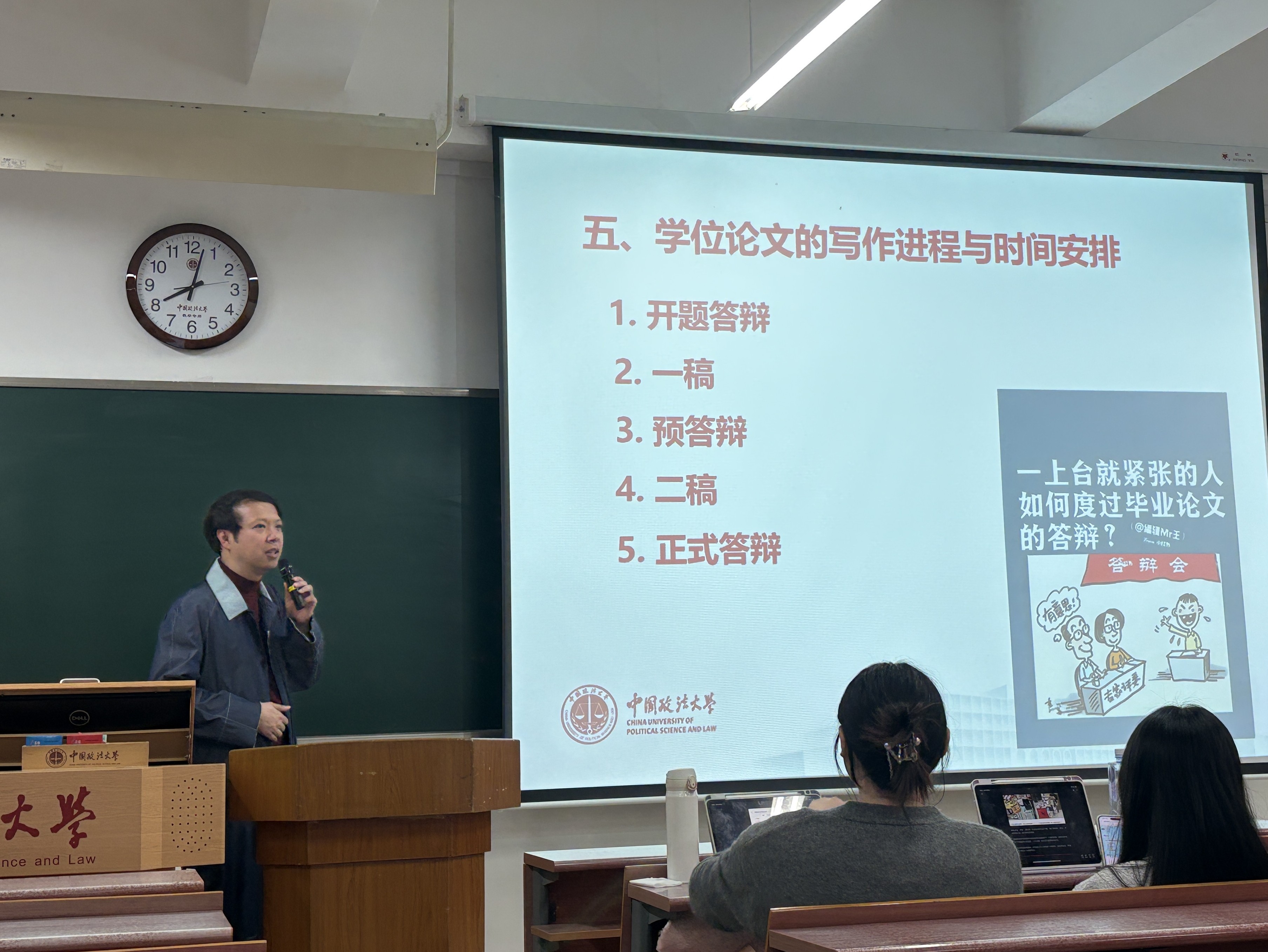 胡思博首先明确了学位论文的定位。他指出,学位论文不等同于纯粹的学术研究,是研究生阶段学习成果的重要体现,也是获得学位的关键环节。在学位论文对学生的能力要求方面,胡思博提出了天赋很重要,但持续的努力同样能够取得进步的观点。其次,胡思博指出,学位论文的写作需注重本土化,并建议同学们将域外制度与中国本土化实践相结合,对制度进行本土化改造。在学位论文的学术规范方面,胡思博通过剖析“翟天临学术不端事件”案例,强调了学术规范的严肃性,并提醒同学们严格规范论文格式。他还解析了脚注和参考文献的不同功能,提醒同学们注意各类文献的规范引用格式。在学位论文的实质内容方面,胡思博理解同学们的创新不易,指出虽然“假、大、空、旧”是同学们选题中普遍存在的问题,但依然有“老题新作”的可能性,鼓励同学们在传统选题中寻找新的视角。此外,胡思博还梳理了硕士学位论文从开题到答辩的时间线,提醒同学们尽早将学位论文的写作提上日程,为后续的就业事宜留出更充裕的时间。