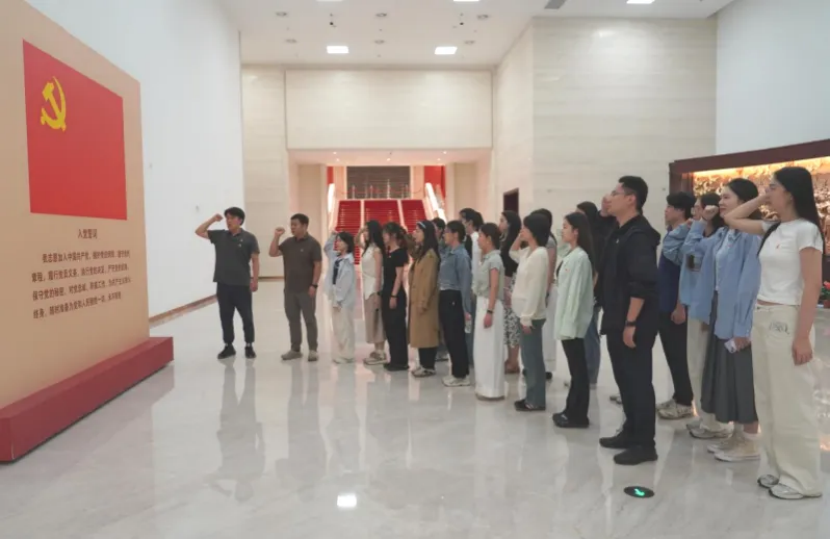 参观结束后,全体党员重温入党誓词,面向党旗,高举右拳庄严宣誓,铿锵誓言回荡在展厅,诠释着青年党员对党的忠诚与信仰。